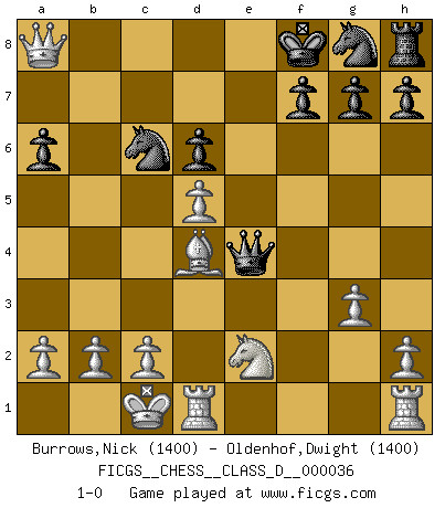 Last move : 1-0 2007 March 13 12:25:0 [Event "FICGS__CHESS__CLASS_D__000036"] [Site "FICGS"] [Date "2007.03.09"] [Round "1"] [White "Burrows,Nick"] [Black "Oldenhof,Dwight"] [Result "1-0"] [WhiteElo "1400"] [BlackElo "1400"] 1.e4 e5 2.f4 d5 3.exd5 Qxd5 4.Nc3 Qe6 5.fxe5 Qxe5+ 6.Be2 Bg4 7.d4 Qe6 8.d5 Qe5 9.Qd3 a6 10.Be3 Bxe2 11.Ngxe2 Bd6 12.Bd4 Qg5 13.Ne4 Qh6 14.Nxd6+ cxd6 15.Qc3 Qh4+ 16.g3 Qe4 17.Qc8+ Ke7 18.O-O-O Nc6 19.Qxb7+ Kf8 20.Qxa8+ 1-0 KGD : Falkbeer counter-gambit Queenside Castling by player White (move 18) Player White won this chess game. Follow this game move after move (download)No Chess Grandmaster is normal; they only differ in the extent of their madness. (Viktor Korchnoi) Sie bekommen vielleicht den Eindruck, dass die Spitzenspieler überhaupt gar nicht so stark sind. Aber das stimmt nicht. Es ist eine Illusion. Mit einem Computer an der Seite ist es sehr leicht, Urteile zu fällen, aber wenn man alleine am Brett sitzt, sieht die Sache ganz anders aus. (Vladimir Kramnik) Bobby Fischer es el jugador de Ajedrez mas grande que jamás haya existido. (Ken Smith) On croit qu'il y a plus de mauvais joueurs que de bons joueurs, c'est faux : Il y a autant de joueurs qui gagnent que de joueurs qui perdent. (Philippe Geluck) Life is pain my dear and anyone who says otherwise is selling something. (Princess Bride)