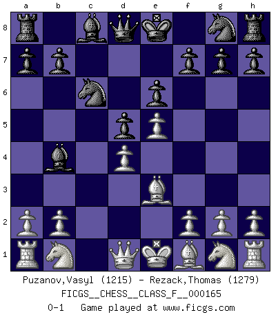 Last move : 0-1 2015 October 14 0:8:49 [Event "FICGS__CHESS__CLASS_F__000165"] [Site "FICGS"] [Date "2015.08.28"] [Round "1"] [White "Puzanov,Vasyl"] [Black "Rezack,Thomas"] [Result "0-1"] [WhiteElo "1215"] [BlackElo "1279"] 1.e4 c5 2.c3 Nc6 3.d4 e6 4.e5 d5 5.Be3 cxd4 6.cxd4 Bb4+ 0-1 This chess game has been lost on time (started : 2015.08.28 14:53:42) Sicilian : Alapin's variation (2.c3) Player Black won this chess game. Follow this game move after move (download)A chess genius has died; a loss for humanity. (Viktor Kortchnoi, about Bobby Fischer's death) Ich war zu klein für die Schach-Schülermannschaft! (Woody Allen) Debemos de asegurarnos de que el Ajedrez no se convierta en un lenguaje muerto, muy interesante, pero solo para un grupo muy pequeño. (Sytze Faber) Pour se monter efficace, un Cavalier a besoin d'avant-postes ! Les Cavaliers font les meilleurs bloqueurs de pions passés. The faster the computer, the slower the brain. (Thibault de Vassal)