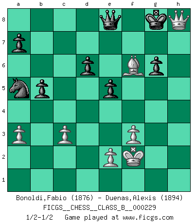 Last move : 1/2-1/2 2015 December 14 19:54:49 [Event "FICGS__CHESS__CLASS_B__000229"] [Site "FICGS"] [Date "2015.08.29"] [Round "1"] [White "Bonoldi,Fabio"] [Black "Duenas,Alexis"] [Result "1/2-1/2"] [WhiteElo "1876"] [BlackElo "1894"] 1.c4 e5 2.g3 Nc6 3.Bg2 f5 4.Nc3 Nf6 5.d3 Bb4 6.a3 Bxc3+ 7.bxc3 O-O 8.Nf3 d6 9.O-O Qe8 10.Rb1 Qh5 11.Qb3 Kh8 12.Re1 Bd7 13.Nd2 Rab8 14.Nf1 b6 15.Qc2 Na5 16.Ne3 f4 17.Bf3 Bg4 18.Nxg4 Nxg4 19.Bxg4 Qxg4 20.Kg2 Qg6 21.f3 Nxc4 22.Kh1 fxg3 23.Rg1 Na5 24.Rxg3 Qe6 25.Rb4 Rf7 26.Rh4 Kg8 27.Qa4 g6 28.Be3 c5 29.Rh6 Rbf8 30.h4 Kg7 31.Bg5 c4 32.h5 Rf5 33.Be3 R8f6 34.hxg6 Rxg6 35.Rhxg6+ hxg6 36.Kg2 Rh5 37.dxc4 Rh4 38.Bg5 Rxc4 39.Qd1 Rc8 40.Rh3 Rh8 41.Rxh8 Kxh8 42.Qh1+ Kg8 43.Qh4 Qf7 44.Bf6 Qe8 45.Kf2 b5 46.Qh8+ 1/2-1/2 English Opening Kingside Castling by player Black (move 7) Kingside Castling by player White (move 9) This chess game ended in a draw. Follow this game move after move (download)It was clear to me that the vulnerable point of the American Grandmaster (Bobby Fischer) was in double-edged, hanging, irrational positions, where he often failed to find a win even in a won position. (Efim Geller) Sehr viele beherrschen heutzutage das große Einmalseins des Schachspiels und kennen sogar dessen Logarithmentafeln auswendig - deshalb sollte man hin und wieder zu beweisen trachten, dass zwei mal zwei auch fünf sein kann. (Mikhail Nekhemyevich Tal) El Ajedrez es tan inspirador que yo no creo que un buen jugador sea capaz de tener un pensamiento malo durante una partida. (Wilhelm Steinitz) Ce qui est bien, c'est d'avoir tout un tas de pièces en prise : l'adversaire ne peut en prendre qu'une à la fois. Cité par Thierry Audin. I know the human being and fish can coexist peacefully. (George W. Bush, Saginaw sept. 29, 2000)