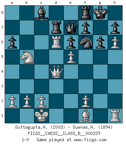 Last move : 1-0 2015 September 13 22:18:48 [Event "FICGS__CHESS__CLASS_B__000229"] [Site "FICGS"] [Date "2015.08.29"] [Round "1"] [White "Duttagupta,Aniruddha"] [Black "Duenas,Alexis"] [Result "1-0"] [WhiteElo "2003"] [BlackElo "1894"] 1.e4 c5 2.Nf3 e6 3.d4 cxd4 4.Nxd4 Nf6 5.Nc3 d6 6.g4 Nc6 7.g5 Nd7 8.h4 a6 9.Be3 Be7 10.Qd2 Nxd4 11.Qxd4 O-O 12.O-O-O b5 13.h5 Bxg5 14.h6 Bxe3+ 15.Qxe3 g6 16.Rxd6 Qe7 17.Qd2 Ra7 18.Qd4 Nf6 19.e5 Rd7 20.Nxb5 1-0 Sicilian : Anderssen variation Kingside Castling by player Black (move 11) Queenside Castling by player White (move 12) Player White won this chess game. Follow this game move after move (download)Examine moves that smite! A good eye for smites is far more important than a knowledge of strategical principles. (Purdy) Warum muß ich gegen diesen IDIOTEN verlieren? (Aaron Nimzowitsch) Una compensación adecuada por un sacrificio es tener una combinación sólida que conduce a una posición ganadora; una compensación adecuada por una metida de pata es dejar a tu oponente arrebatar una derrota de las fauces de la victoria. (Bruce A. Moon) J'ai toujours senti une vague pitié pour l'homme qui ne connaît rien aux échecs, tout comme j'en aurais pour un homme ignorant de l'amour. Les Echecs, comme la musique ou comme l'amour, ont le pouvoir de rendre heureux. (Siegbert Tarrasch) Life is like a ten-speed bicycle: most of us have gears we never use. (Charles M. Schulz)
