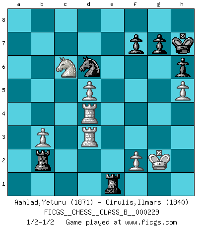 Last move : 1/2-1/2 2016 February 17 20:52:2 [Event "FICGS__CHESS__CLASS_B__000229"] [Site "FICGS"] [Date "2015.08.29"] [Round "1"] [White "Aahlad,Yeturu"] [Black "Cirulis,Ilmars"] [Result "1/2-1/2"] [WhiteElo "1871"] [BlackElo "1840"] 1.e4 c6 2.d4 d5 3.Nc3 dxe4 4.Nxe4 Nf6 5.Nxf6+ exf6 6.Nf3 Bf5 7.Bd3 Bxd3 8.Qxd3 Bd6 9.O-O O-O 10.c4 Qd7 11.Qb3 b6 12.Be3 Na6 13.Rad1 Nc7 14.Rd2 b5 15.cxb5 cxb5 16.d5 a5 17.Rfd1 Rfd8 18.Nd4 Re8 19.Nc6 Re4 20.Qc3 a4 21.h3 Rae8 22.b3 b4 23.Qd3 f5 24.Rc2 axb3 25.axb3 f4 26.Bd2 f3 27.Rc4 Re2 28.Bxb4 fxg2 29.Kxg2 h6 30.Bxd6 Qxd6 31.Qg3 Nb5 32.Qxd6 Nxd6 33.Rf4 Ra2 34.h4 R8e2 35.h5 Kh7 36.R1d4 Re8 37.Rd3 Re1 38.Ra4 Rb2 39.Rad4 1/2-1/2 Caro-Kann : Tartakower (Nimzovich) variation Kingside Castling by player White (move 9) Kingside Castling by player Black (move 9) This chess game ended in a draw. Follow this game move after move (download)No price is too great for the scalp of the enemy King. (Koblentz) Im Internet Chess Club betrug mein Rating vorübergehend 3350 ELO-Punkte. (Sergej Karjakin) Los finales de Peón son del Ajedrez lo que el cesped es del Golf. (Cecil Purdy) Avec des compensations pour le matériel en plus... (Anonyme) Perhaps the current trend of many chess professionals taking up the more lucrative pastime of poker is not a wholly negative one. It may not be too late for humans to relearn how to take risks in order to innovate and thereby maintain the advanced lifestyles we enjoy. And if it takes a poker-playing supercomputer to remind us that we can't enjoy the rewards without taking the risks, so be it. (The Chess Master and the Computer, by Garry Kasparov - 2010)