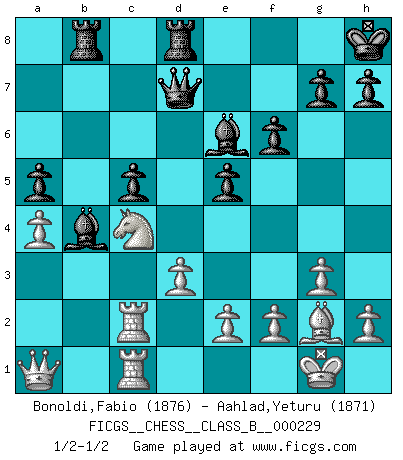 Last move : 1/2-1/2 2016 February 11 20:47:37 [Event "FICGS__CHESS__CLASS_B__000229"] [Site "FICGS"] [Date "2015.08.29"] [Round "1"] [White "Bonoldi,Fabio"] [Black "Aahlad,Yeturu"] [Result "1/2-1/2"] [WhiteElo "1876"] [BlackElo "1871"] 1.c4 e5 2.g3 Nf6 3.Bg2 d5 4.cxd5 Nxd5 5.Nc3 Nb6 6.Nf3 Nc6 7.O-O Be7 8.a3 Be6 9.d3 O-O 10.b4 a5 11.b5 Nd4 12.Bb2 Nb3 13.Rb1 f6 14.Nd2 Nxd2 15.Qxd2 Nc4 16.Qc1 Nxb2 17.Qxb2 Rb8 18.Rbc1 c6 19.Rc2 Qd6 20.a4 Qd4 21.Rb1 Bb4 22.bxc6 bxc6 23.Nd1 c5 24.Ne3 Qd7 25.Qa1 Rfd8 26.Nc4 Kh8 27.Rbc1 1/2-1/2 English Opening Kingside Castling by player White (move 7) Kingside Castling by player Black (move 9) This chess game ended in a draw. Follow this game move after move (download)If your opponent offers you a draw, try to work out why he thinks he's worse off. (Nigel Short) Ich habe die Schachforschung dermaßen betrieben, dass sie auf eine wissenschaftliche Basis gestellt wurde. (Mikhail Moiseyevich Botvinik) ¿Cual es el objetivo de jugar una apertura de gambito?... Para adquirir una reputación de ser un jugador apuesto a costo de perder el juego. (Siegbert Tarrasch) L'action d'une oeuvre littéraire se déroule sur un champ de bataille. Les masques et les types du drame moderne correspondent aux pièces du jeu d'échecs. L'intrigue correspond aux coups et aux gambits, c'est à dire aux techniques du jeu telles qu'utilisées et interprétées par les joueurs. Les tactiques et les péripéties [mouvements] correspondent aux coups exécutés par l'adversaire. (Viktor Shklovsky) Imagination is more important than knowledge. Knowledge is limited. Imagination encircles the world. (Albert Einstein)