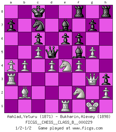 Last move : 1/2-1/2 2016 March 1 17:18:48 [Event "FICGS__CHESS__CLASS_B__000229"] [Site "FICGS"] [Date "2015.08.29"] [Round "1"] [White "Aahlad,Yeturu"] [Black "Bukharin,Alexey"] [Result "1/2-1/2"] [WhiteElo "1871"] [BlackElo "1898"] 1.e4 Nf6 2.e5 Nd5 3.d4 d6 4.Nf3 dxe5 5.Nxe5 c6 6.Be2 Bf5 7.g4 Be6 8.f4 f6 9.Nd3 Bf7 10.O-O Na6 11.Nc3 e6 12.Ne4 Qb6 13.Ndf2 O-O-O 14.c4 Ndb4 15.c5 Qc7 16.Qa4 h5 17.g5 Bg6 18.a3 Nd5 19.Bxa6 bxa6 20.Qxa6+ Qb7 21.Qc4 h4 22.Bd2 h3 23.b4 Qd7 24.Qa6+ Qb7 25.Qd3 Qd7 26.Rfe1 Nc7 27.Qg3 Bf5 28.Bc3 Be7 29.a4 Qd5 30.Ra3 Rdf8 31.Bb2 1/2-1/2 Alekhine's defense : Modern, Larsen variation Kingside Castling by player White (move 10) Queenside Castling by player Black (move 13) This chess game ended in a draw. Follow this game move after move (download)Many Chess players were surprised when after the game, Fischer quietly explained: 'I had already analyzed this possibility' in a position which I thought was not possible to foresee from the opening. (Mikhail Tal) Ein Isolani verdüstert die Stimmung auf dem ganzen Schachbrett. (Savielly Grigorievitsch Tartakower) No soy una persona materialista y por eso, no resiento la falta o pérdida del dinero. La ausencia de cosas mundanas carece de importancia. Ya que el Ajedrez es una forma en la que puedo ser tan materialista como yo desee sin tener la necesidad de vender mi alma. (Jamie Walter Adams) Le joueur d'Echecs qui veut atteindre le top est obligé de développer son propre credo créatif. Alexeï Stepanovicth Souétine. Il est facile d'écrire des livres ! Ce qui est difficile, c'est de jouer ! (Alexeï Stepanovicth Souétine) Watch your thoughts; they become words. Watch your words; they become actions. Watch your actions; they become habits. Watch your habits; they become character. Watch your character; it becomes your destiny. (Frank Outlaw)