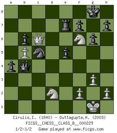 Last move : 1/2-1/2 2015 December 17 20:24:0 [Event "FICGS__CHESS__CLASS_B__000229"] [Site "FICGS"] [Date "2015.08.29"] [Round "1"] [White "Cirulis,Ilmars"] [Black "Duttagupta,Aniruddha"] [Result "1/2-1/2"] [WhiteElo "1840"] [BlackElo "2003"] 1.b4 e5 2.a3 g6 3.c4 Bg7 4.e4 Nf6 5.d3 a5 6.b5 c6 7.Nf3 cxb5 8.cxb5 d5 9.Nbd2 O-O 10.a4 Re8 11.Be2 Nbd7 12.Ba3 b6 13.Rc1 Bb7 14.O-O Rc8 15.Rxc8 Qxc8 16.Qb1 Qc3 17.Qa2 Bf8 18.Bb2 Qb4 19.Bd1 dxe4 20.dxe4 Nxe4 21.Bb3 Nd6 22.Ba3 Qf4 23.Bxd6 Bxd6 24.Bd5 Nc5 25.Bxb7 Nxb7 26.Qd5 Re7 27.g3 Qxa4 28.Ne4 Bc5 29.Qc6 Qa3 30.Rd1 Qb3 31.Rd5 a4 32.Nfd2 Qb4 33.Rxc5 Nxc5 34.Nf6+ 1/2-1/2 Polish (Sokolsky) opening Kingside Castling by player Black (move 9) Kingside Castling by player White (move 14) This chess game ended in a draw. Follow this game move after move (download)Chess is a beautiful mistress. (Bent Larsen) Im Hotelzimmer gab es nur zwei Schaben. (Über die Turnierbedingungen) (Peter Swidler) Un buen jugador siempre tiene buena suerte. (José Raúl Capablanca) Nous vivons dans un monde échiquéen : chaque jour qui passe est un défi à relever. (Philosophe Sasha) The only thing that matters is the evidence. (Horatio Caine, C.S.I. Miami)