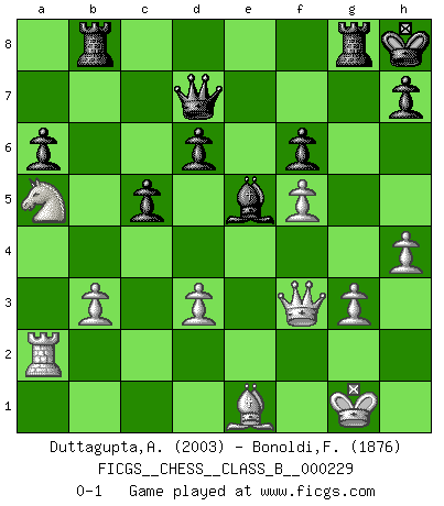 Last move : 0-1 2016 March 14 6:25:43 [Event "FICGS__CHESS__CLASS_B__000229"] [Site "FICGS"] [Date "2015.08.29"] [Round "1"] [White "Duttagupta,Aniruddha"] [Black "Bonoldi,Fabio"] [Result "0-1"] [WhiteElo "2003"] [BlackElo "1876"] 1.e4 d6 2.d4 Nf6 3.Nc3 g6 4.f4 Bg7 5.Nf3 O-O 6.Bd3 Na6 7.O-O c5 8.d5 Nc7 9.a4 Rb8 10.Qe1 a6 11.a5 Bd7 12.h3 b5 13.axb6 Rxb6 14.Nd2 Qc8 15.Nc4 Rb8 16.b3 Bb5 17.Bd2 Nd7 18.Na5 Bxd3 19.cxd3 Re8 20.Kh2 Nb5 21.Ra2 Nd4 22.Qd1 e6 23.dxe6 Rxe6 24.Nd5 Nf6 25.f5 gxf5 26.Rxf5 Nxf5 27.exf5 Re8 28.Nxf6+ Bxf6 29.Qf3 Be5+ 30.g3 Kh8 31.h4 Rg8 32.Be1 f6 33.Kg1 Qd7 0-1 Pirc : Austrian attack, 6.Bd3 Kingside Castling by player Black (move 5) Kingside Castling by player White (move 7) Player Black won this chess game. Follow this game move after move (download)If Chess is a science, it's a most inexact one. If Chess is an art, it is too exacting to be seen as one. If Chess is a sport, it's too esoteric. If Chess is a game, it's too demanding to be just a game. If Chess is a mistress, she's a demanding one. If Chess is a passion, it's a rewarding one. If Chess is life, it's a sad one. (Unknown) Du musst Deinen Gegner in einen tiefen dunklen Wald führen wo 2+2=5 ist und wo der Weg, der wieder hinausführt, nur breit genug für einen ist. (Mikhail Nekhemyevich Tal) Con el fin de mejorar tu juego, debes de estudiar los finales antes que todo, ya que mientras que los finales pueden ser estudiados y dominados por sí mismos, el juegomedio y la apertura deben de ser estudiados en relación con los finales. (José Raúl Capablanca) Les réformistes prétendent que les progrès de la théorie conduiront à la disparition des échecs, et qu'il faut, pour leur rendre vie, en remanier les règles. En réalité, qu'exprime cette affirmation? Le mépris de l'intuition, de l'imagination et de tous les autres éléments qui font des échecs un art. (Alexander Alekhine) This is where the fun begins. (Anakin Skywalker in Star Wars ep.3)