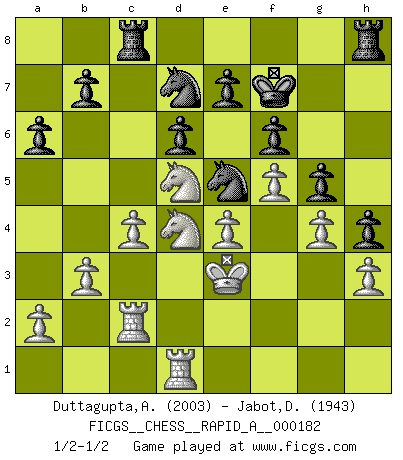 Last move : 1/2-1/2 2015 December 6 7:46:43 [Event "FICGS__CHESS__RAPID_A__000182"] [Site "FICGS"] [Date "2015.09.01"] [Round "1"] [White "Duttagupta,Aniruddha"] [Black "Jabot,Daniel"] [Result "1/2-1/2"] [WhiteElo "2003"] [BlackElo "1943"] 1.c4 Nf6 2.Nc3 c5 3.g3 g6 4.Bg2 Bg7 5.e3 O-O 6.Nge2 Nc6 7.d4 cxd4 8.Nxd4 d6 9.O-O Qc7 10.b3 Bg4 11.Qd2 Rac8 12.Bb2 Qd7 13.f3 Bh3 14.e4 Bxg2 15.Kxg2 Qc7 16.Rad1 Rfe8 17.Ndb5 Qa5 18.Nd5 Qxd2+ 19.Rxd2 Nd7 20.Bxg7 Kxg7 21.f4 a6 22.Nbc3 h5 23.Kf3 h4 24.g4 f6 25.h3 Nd8 26.Ne2 Nf7 27.Ke3 g5 28.f5 Nfe5 29.Nd4 Kf7 30.Rfd1 Rg8 31.Rc2 Rh8 1/2-1/2 English Opening Kingside Castling by player Black (move 5) Kingside Castling by player White (move 9) This chess game ended in a draw. Follow this game move after move (download)It is the aim of the modern school, not to treat every position according to one general law, but according to the principle inherent in the position. (Richard Reti) Alles was ich jemals tun will ist Schach spielen. (Robert James Fischer) No existe un remordimiento como el remordimiento del Ajedrez. (H. G. Wells) Le système Elo représente seulement une moyenne. Il est simplement un indicateur de votre stabilité. (Anatoli Karpov) Opportunities multiply as they are seized. (Sun Tzu)
