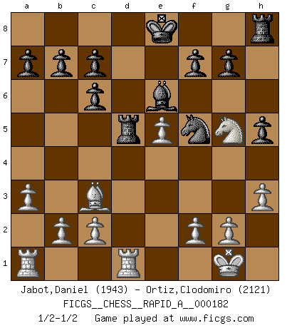 Last move : 1/2-1/2 2015 September 19 19:6:13 [Event "FICGS__CHESS__RAPID_A__000182"] [Site "FICGS"] [Date "2015.09.01"] [Round "1"] [White "Jabot,Daniel"] [Black "Ortiz,Clodomiro"] [Result "1/2-1/2"] [WhiteElo "1943"] [BlackElo "2121"] 1.e4 e5 2.Nf3 Nc6 3.Bb5 Nf6 4.O-O Nxe4 5.d4 Nd6 6.Bxc6 dxc6 7.dxe5 Nf5 8.Qxd8+ Kxd8 9.Rd1+ Ke8 10.h3 Be7 11.Nc3 Be6 12.Bg5 Bb4 13.Bd2 Rd8 14.a3 Bxc3 15.Bxc3 h5 16.Ng5 Rd5 1/2-1/2 Ruy Lopez : Berlin defense, Open variation Kingside Castling by player White (move 4) This chess game ended in a draw. Follow this game move after move (download)There are tough players and nice guys, and I'm a tough player. (Bobby Fischer) Spiel ein langweiliges Spiel zu Ende und lustige Dinge können passieren. (Hans Ree) Un buen sacrificio es aquel que aunque no sea necesariamente sólido, deja a tu oponente aturdido y confuso. (Rudolph Spielmann) Les échecs, c'est l'art d'analyser. (Mikhail Botvinnik) The difference between stupidity and genius is that genius has its limits. (Murphy)