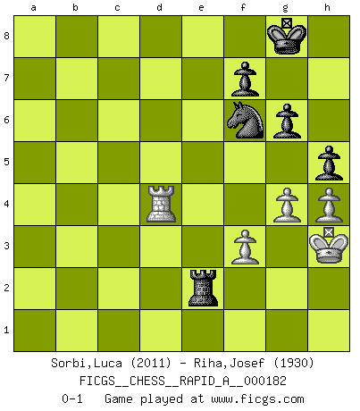 Last move : 0-1 2015 September 25 13:30:57 [Event "FICGS__CHESS__RAPID_A__000182"] [Site "FICGS"] [Date "2015.09.01"] [Round "1"] [White "Sorbi,Luca"] [Black "Riha,Josef"] [Result "0-1"] [WhiteElo "2011"] [BlackElo "1930"] 1.e4 e5 2.Nf3 Nf6 3.Nxe5 d6 4.Nf3 Nxe4 5.d4 d5 6.Bd3 Nc6 7.O-O Be7 8.c4 Nb4 9.Be2 O-O 10.Nc3 Bf5 11.a3 Nxc3 12.bxc3 Nc6 13.Re1 Re8 14.cxd5 Qxd5 15.Bf4 Rac8 16.Bd3 Qd7 17.Rb1 Bxd3 18.Qxd3 b6 19.d5 Bf6 20.c4 h6 21.h3 Ne7 22.Bh2 Ng6 23.Rbd1 Rxe1+ 24.Rxe1 Be7 25.Re4 Bc5 26.Bg3 Rd8 27.Re1 a6 28.Nd2 Bd6 29.Bxd6 Qxd6 30.Ne4 Qd7 31.Qe3 b5 32.Nc5 Qc8 33.Qc3 bxc4 34.Qxc4 Qf5 35.Nxa6 Rxd5 36.Qxc7 Nf4 37.Nb4 Rd2 38.Rf1 Qe4 39.Qc6 Qxc6 40.Nxc6 Ra2 41.h4 Rxa3 42.Rd1 g6 43.g3 Nh5 44.Kg2 Nf6 45.Rd4 h5 46.f3 Ra2+ 47.Kh3 Re2 48.Ne5 Rxe5 49.g4 Re2 0-1 Petrov : Classical attack Kingside Castling by player White (move 7) Kingside Castling by player Black (move 9) Player Black won this chess game. Follow this game move after move (download)It is always better to sacrifice your opponent's men. (Savielly Tartakower) Ich war zu klein für die Schach-Schülermannschaft! (Woody Allen) No soy una persona materialista y por eso, no resiento la falta o pérdida del dinero. La ausencia de cosas mundanas carece de importancia. Ya que el Ajedrez es una forma en la que puedo ser tan materialista como yo desee sin tener la necesidad de vender mi alma. (Jamie Walter Adams) Toutes choses étant égales, c'est la conviction qui gagne. Alliée à une volonté de vaincre, elle sert de détonateur, suscite des idées, disperse les doutes et aide à penser clairement. (Robert Fischer) That's absurd. I love it. (Gregory House, House M.D.)