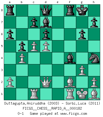 Last move : 0-1 2015 October 28 15:38:2 [Event "FICGS__CHESS__RAPID_A__000182"] [Site "FICGS"] [Date "2015.09.01"] [Round "1"] [White "Duttagupta,Aniruddha"] [Black "Sorbi,Luca"] [Result "0-1"] [WhiteElo "2003"] [BlackElo "2011"] 1.c4 Nf6 2.Nc3 g6 3.e4 d6 4.g3 Bg7 5.Bg2 O-O 6.d4 e5 7.Nge2 Nc6 8.d5 Ne7 9.O-O Nd7 10.Be3 f5 11.Qd2 Nf6 12.f3 Bd7 13.Rac1 a6 14.b4 fxe4 15.Nxe4 b5 16.Nxf6+ Bxf6 17.c5 Nf5 18.Bf2 Bg5 19.f4 exf4 20.Nxf4 Nh4 21.Bh1 Bxf4 0-1 This chess game has been lost on time (started : 2015.09.01 9:57:4) English Opening Kingside Castling by player Black (move 5) Kingside Castling by player White (move 9) Player Black won this chess game. Follow this game move after move (download)Pawns are born free, yet they are everywhere in chains. (Rick Kennedy) Obwohl ich vom Stil her kaum zu den Priestern der Schachkunst gezählt werde, halte ich Schach doch für eine Kunst. (Tigran Petrosjan) Un buen jugador siempre tiene buena suerte. (José Raúl Capablanca) L'action d'une oeuvre littéraire se déroule sur un champ de bataille. Les masques et les types du drame moderne correspondent aux pièces du jeu d'échecs. L'intrigue correspond aux coups et aux gambits, c'est à dire aux techniques du jeu telles qu'utilisées et interprétées par les joueurs. Les tactiques et les péripéties [mouvements] correspondent aux coups exécutés par l'adversaire. (Viktor Shklovsky) An expert is a man who has made all the mistakes which can be made in a very narrow field. (Niels Bohr)
