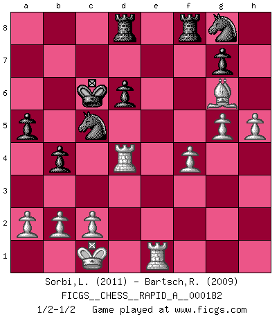 Last move : 1/2-1/2 2015 September 26 18:38:32 [Event "FICGS__CHESS__RAPID_A__000182"] [Site "FICGS"] [Date "2015.09.01"] [Round "1"] [White "Sorbi,Luca"] [Black "Bartsch,Reinhard Andrea"] [Result "1/2-1/2"] [WhiteElo "2011"] [BlackElo "2009"] 1.e4 c5 2.Nf3 d6 3.d4 cxd4 4.Nxd4 Nf6 5.Nc3 a6 6.Bg5 e6 7.f4 Nbd7 8.Qf3 Qc7 9.O-O-O b5 10.Bd3 Bb7 11.Rhe1 Be7 12.Qg3 b4 13.Nd5 exd5 14.exd5 Kd8 15.Nc6+ Bxc6 16.dxc6 Nc5 17.Bh4 Rg8 18.Bc4 Nfe4 19.Qg4 Bxh4 20.Qxh4+ Kc8 21.Qxh7 Nf6 22.Qf5+ Kb8 23.g4 Rc8 24.g5 Ng8 25.Qxf7 Qxf7 26.Bxf7 Kc7 27.Rd4 Rf8 28.Bh5 a5 29.h4 Rad8 30.Bg6 Kxc6 31.h5 Kd7 32.Red1 Kc6 33.Re1 Kd7 34.Red1 Kc6 35.Re1 1/2-1/2 Sicilian : Najdorf, 7.f4 Queenside Castling by player White (move 9) This chess game ended in a draw. Follow this game move after move (download)For me, Chess is life and every game is like a new life. Every Chess player gets to live many lives in one lifetime. (Eduard Gufeld) Wir können eben der zündenden Macht des Opfers nicht wiederstehen, denn die Begeisterung für das Opfer liegt in der Natur des Menschen. (Rudolf Spielmann) No solamente yo pronostico su triunfo sobre Botvinnik, sino que me adelanto y digo que probablemente Fischer es el jugador de Ajedrez mas grande que haya existido. (John Collins) Les écrivains ont utilisé les échecs pour analyser les côtés extrêmes de la nature humaine. Dans ce cadre, les échecs offrent un champ d'expérimentation idéal. Mais on pourrait faire la même chose avec la peinture. Et là, en vous référant à Van Gogh, vous ne tirerez pas de conclusion définitive sur les peintres. (Gary Kasparov) A shortcut is the longest distance between two points. (Don Groves)