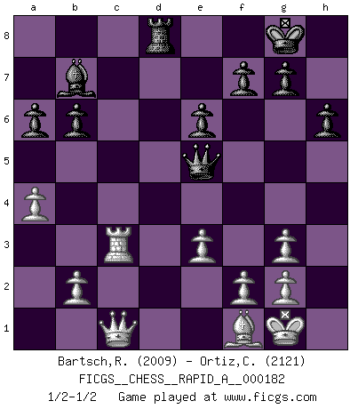 Last move : 1/2-1/2 2015 September 7 12:51:21 [Event "FICGS__CHESS__RAPID_A__000182"] [Site "FICGS"] [Date "2015.09.01"] [Round "1"] [White "Bartsch,Reinhard Andrea"] [Black "Ortiz,Clodomiro"] [Result "1/2-1/2"] [WhiteElo "2009"] [BlackElo "2121"] 1.d4 Nf6 2.c4 e6 3.Nf3 b6 4.Nc3 Bb7 5.a3 d5 6.Bf4 dxc4 7.e3 a6 8.Bxc4 Bd6 9.Bg3 Nbd7 10.O-O Bxg3 11.hxg3 c5 12.a4 O-O 13.Qe2 Qc7 14.Rfd1 cxd4 15.Rxd4 Nc5 16.Rc1 Rfd8 17.Qf1 Qe7 18.Ne5 Nd5 19.Nd3 Nxc3 20.Rxd8+ Rxd8 21.Nxc5 Qxc5 22.Rxc3 Qf5 23.Bd3 Qe5 24.Qc1 h6 25.Bf1 1/2-1/2 Queen's Indian : 4.Nc3 Kingside Castling by player White (move 10) Kingside Castling by player Black (move 12) This chess game ended in a draw. Follow this game move after move (download)Good offense and good defense both begin with good development. (Bruce A. Moon) Du weisst es gibt ein Problem mit Computern und Fernschach, wenn jeder eine Rating von 2450 hat. (John Christen Knudsen) Bobby solo arroja las piezas y solas caen en las casillas correctas. (Miguel Najdorf ) La vie et les Echecs sont tous les deux une lutte constante. (Lasker) Beep ! (R2D2 in Star Wars ep.3)