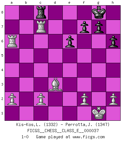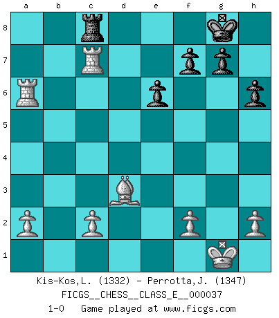 Last move : 1-0 2007 June 14 18:14:4 [Event "FICGS__CHESS__CLASS_E__000037"] [Site "FICGS"] [Date "2007.03.09"] [Round "1"] [White "Kis-Kos,Laszlo"] [Black "Perrotta,John Zach"] [Result "1-0"] [WhiteElo "1332"] [BlackElo "1347"] 1.e4 d5 2.exd5 Qxd5 3.Nc3 Qa5 4.d4 c6 5.Nf3 Nf6 6.Be2 Bf5 7.O-O e6 8.Nh4 Nbd7 9.Nxf5 Qxf5 10.g4 Qg6 11.g5 h6 12.Bd3 Qh5 13.gxf6 Qxd1 14.Nxd1 Nxf6 15.Ne3 Bd6 16.Nc4 Bc7 17.Ne5 c5 18.Be3 cxd4 19.Bxd4 O-O 20.Rfe1 Rad8 21.Bc3 Nd5 22.Rad1 Nxc3 23.bxc3 Bxe5 24.Rxe5 Rc8 25.Ra5 a6 26.Rb1 Rxc3 27.Rxb7 Rfc8 28.Rxa6 R3c7 29.Rxc7 1-0 Scandinavian (centre counter) defense Kingside Castling by player White (move 7) Kingside Castling by player Black (move 19) Player White won this chess game. Follow this game move after move (download)All that matters on the Chessboard is good moves. (Bobby Fischer) Viele Opfer benötigen überhaupt keine konkrete Berechnung. Es genügt sich die entstehende Position kurz vorzustellen, um uns davon zu überzeugen, dass das Opfer korrekt ist. (Mikhail Nekhemyevich Tal) Si pudieramos observar el interior de la cabeza de un jugador de Ajedrez, encontraríamos ahí un mundo lleno de sentimientos, imágenes, ideas, emoción y pasión. (Alfred Binet) C'est une question de caractère, Beaucoup de gens perdent leur motivation très vite. D'autres, ils sont rares, peuvent la conserver très longtemps. J'aime les échecs, encore aujourd'hui je suis heureux d'analyser des parties. J'aime toujours gagner, je déteste encore perdre. Bien jouer est important pour mon intégrité intellectuelle et morale. Et puis les échecs vivent en ce moment une période historique grâce à Internet. Ils se développent dans les systèmes éducatifs à travers le monde. Ils sortent de leur ghetto, et c'est mon rôle de mener à bien cette révolution. (Gary Kasparov) You can't play chess if you're groggy from pills. (Anatoly Karpov)