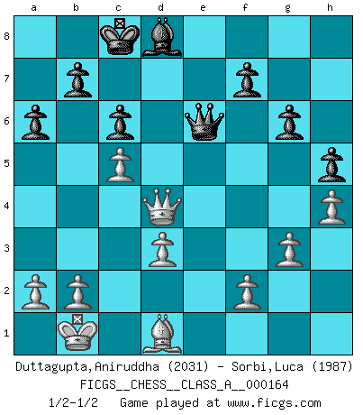 Last move : 1/2-1/2 2015 November 26 11:10:36 [Event "FICGS__CHESS__CLASS_A__000164"] [Site "FICGS"] [Date "2015.09.03"] [Round "1"] [White "Duttagupta,Aniruddha"] [Black "Sorbi,Luca"] [Result "1/2-1/2"] [WhiteElo "2031"] [BlackElo "1987"] 1.e4 e5 2.Nf3 Nf6 3.Nxe5 d6 4.Nf3 Nxe4 5.Nc3 Nxc3 6.dxc3 Be7 7.Be3 Nc6 8.Qd2 Be6 9.O-O-O Qd7 10.Kb1 a6 11.h4 h6 12.Nd4 Nxd4 13.Bxd4 Rg8 14.c4 O-O-O 15.Qc3 g6 16.g3 Qc6 17.Rg1 d5 18.c5 h5 19.Bg2 Rge8 20.Rd3 Bf8 21.Re1 Bh6 22.Bf6 Bf5 23.Bxd8 Bxd3 24.Rxe8 Qxe8 25.Bg5 Bxg5 26.cxd3 Bd8 27.Bxd5 c6 28.Bb3 Qe2 29.Qd4 Qf1+ 30.Kc2 Qe2+ 31.Kc1 Qe1+ 32.Bd1 Qe6 33.Kb1 1/2-1/2 Petrov : Nimzovich attack Queenside Castling by player White (move 9) Queenside Castling by player Black (move 14) This chess game ended in a draw. Follow this game move after move (download)It's always better to sacrifice your opponent's men. (Savielly Tartakover) Schach ist das schnellste Spiel der Welt, weil man in jeder Sekunde Tausende von Gedanken ordnen muß. (Albert Einstein) Tu puedes aprender mucho mas de una partida que pierdas que de una partida ganada. Tendras que perder cientos de partidas antes de llegar a ser un buen jugador. (Jose Raul Capablanca) Des combinaisons [dans le jeu d'échecs] pareilles à des mélodies. Je crois entendre pour ainsi dire la musique des coups... (Vladimir Nabokov) Gambling : The sure way of getting nothing from something. (Wilson Mizner)
