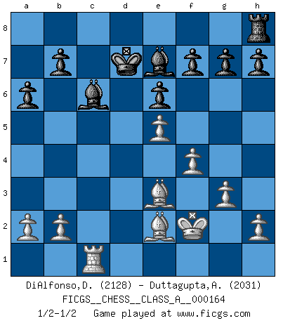 Last move : 1/2-1/2 2015 October 5 2:45:57 [Event "FICGS__CHESS__CLASS_A__000164"] [Site "FICGS"] [Date "2015.09.03"] [Round "1"] [White "DiAlfonso,Darren"] [Black "Duttagupta,Aniruddha"] [Result "1/2-1/2"] [WhiteElo "2128"] [BlackElo "2031"] 1.e4 c6 2.d4 d5 3.e5 Bf5 4.Nf3 e6 5.Be2 c5 6.Be3 cxd4 7.Nxd4 Ne7 8.c4 Nbc6 9.Qa4 a6 10.Na3 Qa5+ 11.Qxa5 Nxa5 12.O-O dxc4 13.Nxc4 Nxc4 14.Bxc4 Be4 15.Rac1 Bd5 16.Be2 Rc8 17.Rxc8+ Nxc8 18.Rc1 Kd7 19.Rd1 Ne7 20.f4 Kc7 21.Kf2 Nc6 22.Nxc6 Bxc6 23.Rc1 Kd7 24.g3 Be7 1/2-1/2 Caro-Kann : Advance variation Kingside Castling by player White (move 12) This chess game ended in a draw. Follow this game move after move (download)When I asked Fischer why he had not played a certain move in our game, he replied: 'Well, you laughed when I wrote it down !' (Mikhail Tal) Lisa Lane, amerikanische Schachmeisterin, hatte Fischer einmal als stärksten lebenden Spieler bezeichnet. Antwort: Das ist richtig, aber Lisa Lane ist eigentlich nicht in der Lage, das zu beurteilen. (Robert James Fischer) Por esta medida (el intervalo entre Fischer y sus contemporaneos), yo le considero el mas grande campeón mundial. (Garry Kasparov) Aucun coup ne doit être joué sans but. (Pedro Damiano) A good aphorism is too hard for the tooth of time, and is not worn away with the centuries, although it serves as food for every speech. (Friedrich Nietzsche)