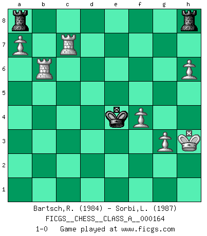 Last move : 1-0 2015 October 18 22:56:15 [Event "FICGS__CHESS__CLASS_A__000164"] [Site "FICGS"] [Date "2015.09.03"] [Round "1"] [White "Bartsch,Reinhard Andrea"] [Black "Sorbi,Luca"] [Result "1-0"] [WhiteElo "1984"] [BlackElo "1987"] 1.d4 d5 2.c4 e6 3.Nc3 Nf6 4.Nf3 Be7 5.e3 O-O 6.a3 b6 7.cxd5 exd5 8.b4 Bb7 9.Bb2 a6 10.Bd3 Nbd7 11.O-O Bd6 12.Qc2 Re8 13.Qb3 c6 14.Na4 Ne4 15.Qc2 f5 16.g3 Qc7 17.Rac1 g6 18.Rfd1 Rab8 19.Bf1 Rbc8 20.Qb3 b5 21.Nc5 Nb6 22.Qc2 Nc4 23.a4 Qg7 24.Bxc4 bxc4 25.Ne5 Rc7 26.f3 Ng5 27.Kg2 Bc8 28.Bc3 a5 29.h4 Nf7 30.f4 axb4 31.Bxb4 Nh6 32.a5 Ng4 33.Re1 Nf6 34.Rb1 h6 35.Rh1 Ng4 36.Qd2 Nf6 37.Bc3 Bxc5 38.dxc5 Ne4 39.Qc1 Qe7 40.Rb6 Be6 41.Nxg6 Qh7 42.Ne5 Nxc5 43.Kh2 Rec8 44.Bd4 Ne4 45.Qa3 Bf7 46.Rg1 h5 47.a6 Be8 48.Nf3 Qe7 49.Qb2 Nc5 50.Bxc5 Qxc5 51.Nd4 c3 52.Qb3 Bd7 53.Rc1 Qc4 54.Rxc3 Qxb3 55.Rcxb3 c5 56.Nb5 Bxb5 57.R3xb5 Kf7 58.Kg2 Re7 59.Rd6 Rxe3 60.Rh6 Re2+ 61.Kh3 Kg7 62.Rxh5 Re7 63.Rxf5 c4 64.Rfxd5 c3 65.Rdc5 R7e8 66.Rb7+ Kf6 67.Rbc7 c2 68.Rxc2 Rcd8 69.a7 Ra8 70.R2c6+ Kf5 71.h5 Ke4 72.Rb6 Rh8 73.h6 1-0 QGD : 4.Nf3 Kingside Castling by player Black (move 5) Kingside Castling by player White (move 11) 10 pieces endgame at move 68 : White KRRPPPP , Black KRR WHITE : King + 2 Rooks 4 Pawns BLACK : King + 2 Rooks Player White won this chess game. Follow this game move after move (download)If your opponent cannot do anything active, then don't rush the position; instead you should let him sit there, suffer, and beg you for a draw. (Jeremy Silman) Ich moechte nie einem Club beitreten, der Leute wie mich als Mitglieder aufnimmt. (Woody Allen) Nada excita más a Grandes Maestros aburridos que una novedad teórica. (Dominic Lawson) Toutes les manuvres exécutées sur une colonne ouverte ont pour but ultime l'intrusion définitive sur la septième ou la huitième rangée, en plein cur de la position ennemie. (Aaron Nimzovitch) A good player is always lucky. (Capablanca)