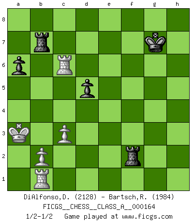 Last move : 1/2-1/2 2015 October 5 21:55:7 [Event "FICGS__CHESS__CLASS_A__000164"] [Site "FICGS"] [Date "2015.09.03"] [Round "1"] [White "DiAlfonso,Darren"] [Black "Bartsch,Reinhard Andrea"] [Result "1/2-1/2"] [WhiteElo "2128"] [BlackElo "1984"] 1.e4 c5 2.Nf3 d6 3.d4 cxd4 4.Nxd4 Nf6 5.Nc3 a6 6.Be3 e6 7.Qf3 Qc7 8.g4 h6 9.h4 Nbd7 10.Qg2 h5 11.f3 hxg4 12.fxg4 Ne5 13.g5 Nh5 14.a4 g6 15.O-O-O Bd7 16.Nb3 Bg7 17.Kb1 Bc6 18.Rh3 Nd7 19.Nd5 Qd8 20.Be2 Bxa4 21.Bxh5 exd5 22.Bg4 Ne5 23.Bd4 dxe4 24.Qxe4 O-O 25.Qf4 Bd7 26.Bxd7 Qxd7 27.Rdh1 Qf5 28.Qxf5 gxf5 29.h5 Nc6 30.Bxg7 Kxg7 31.Rf3 f6 32.Rxf5 fxg5 33.Rxg5+ Kh7 34.Rg6 Rad8 35.Nd2 d5 36.Rhg1 Rd7 37.Nb3 Rc7 38.Rd6 Rf5 39.c3 Rcf7 40.Ka2 Rxh5 41.Nc5 Rhf5 42.Nxb7 Rxb7 43.Rxc6 Rf2 44.Rb1 Kg7 45.Ka3 1/2-1/2 Sicilian : Najdorf, Byrne (English) attack Queenside Castling by player White (move 15) Kingside Castling by player Black (move 24) 10 pieces endgame at move 43 : White KRRPP , Black KRRPP WHITE : King + 2 Rooks 2 Pawns BLACK : King + 2 Rooks 2 Pawns This chess game ended in a draw. Follow this game move after move (download)Only the player with the initiative has the right to attack. (Wilhelm Steinitz) Der Bart als Geschlechtszeichen mitten im Gesicht ist obszön. Daher gefällt er den Weibern. [Zugegeben, kein Schachzitat, aber unglaublich originell] (Arthur Schopenhauer) Tu sabes, camarada Pachman, no disfruto el ser un Ministro, preferería jugar al Ajedrez como tu. (Che Guevara) Les Echecs ont trois composantes : le temps, l'espace et le matériel en dernier. (Mikhail Tal) If you work for a living, why do you kill yourself working ? (Tuco to a chicken in The Good, The Bad and The Ugly)