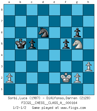 Last move : 1/2-1/2 2015 October 5 19:57:56 [Event "FICGS__CHESS__CLASS_A__000164"] [Site "FICGS"] [Date "2015.09.03"] [Round "1"] [White "Sorbi,Luca"] [Black "DiAlfonso,Darren"] [Result "1/2-1/2"] [WhiteElo "1987"] [BlackElo "2128"] 1.e4 e5 2.Nf3 Nc6 3.d4 exd4 4.Nxd4 Nf6 5.Nxc6 bxc6 6.e5 Qe7 7.Qe2 Nd5 8.c4 Ba6 9.b3 g6 10.f4 d6 11.Qf2 Nf6 12.Be2 dxe5 13.Ba3 Qe6 14.fxe5 Bxa3 15.Nxa3 Nd7 16.Nc2 Nxe5 17.O-O Qe7 18.Ne1 O-O-O 19.Qxa7 Bb7 20.c5 f5 21.Ba6 Bxa6 22.Qxa6+ Kb8 23.b4 Qh4 24.Kh1 Qc4 25.Qxc4 Nxc4 26.Nf3 Rhe8 27.Rfd1 Kb7 28.Rxd8 Rxd8 29.Ng5 Rd7 30.Kg1 Re7 31.Kf2 Ka6 32.Nf3 Re4 33.Rd1 Kb5 34.Rd7 Kxb4 35.Rxc7 Kxc5 36.Rxh7 Re6 37.h3 Kb6 38.Ng5 Rd6 39.Re7 Kb5 40.Re6 c5 41.Rxd6 Nxd6 1/2-1/2 Scotch : Mieses variation Kingside Castling by player White (move 17) Queenside Castling by player Black (move 18) 10 pieces endgame at move 41 : White KNPPP , Black KNPPP WHITE : King + 1 Knight 3 Pawns BLACK : King + 1 Knight 3 Pawns This chess game ended in a draw. Follow this game move after move (download)Chess is in its essence a game, in its form an art, and in its execution a science. (Baron Tassilo) Schach wird sich dank seiner hohen kulturellen Tradition immer durchsetzen. In näherer Zukunft womöglich sogar als Gegenreaktion auf die maßlose Reizüberflutung im Freizeit- und Spielbereich. (Garry Kasparov) El Ajedrez se juega con la mente... ¡no con las manos!. (Renaud y Kahn) Les échecs sont plus proches de l'art de l'assassinat que de l'art de la guerre. (Arturo Perez-Reverte) A government big enough to give you everything you want is strong enough to take everything you have. (Thomas Jefferson)