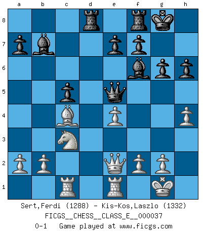 Last move : 0-1 2007 June 13 1:11:17 [Event "FICGS__CHESS__CLASS_E__000037"] [Site "FICGS"] [Date "2007.03.09"] [Round "1"] [White "Sert,Ferdi"] [Black "Kis-Kos,Laszlo"] [Result "0-1"] [WhiteElo "1288"] [BlackElo "1332"] 1.d4 Nf6 2.c4 g6 3.Nc3 d5 4.Nf3 Bg7 5.e3 O-O 6.Bd3 dxc4 7.Bxc4 c5 8.O-O cxd4 9.Nxd4 Nc6 10.Nxc6 bxc6 11.Qe2 Bb7 12.e4 Qc7 13.Bg5 Rad8 14.Rac1 Qe5 15.h4 c5 16.Rfe1 h6 17.Bxf6 Bxf6 0-1 This chess game has been lost on time (started : 2007.03.09 21:47:23) King's Indian defense, 3.Nc3 Kingside Castling by player Black (move 5) Kingside Castling by player White (move 8) Player Black won this chess game. Follow this game move after move (download)Chess is imagination. (David Bronstein) Ohne Fehler kann es keine Brillanz geben. (Emanuel Lasker) Bobby Fischer es el mas grande genio de Ajedrez de todos los tiempos. (Alexander Kotov) Une platitude souvent récitée à propos des Echecs est qu'une des choses les plus difficiles à réaliser est de gagner une position gagnante. Cela ne manque pas de sens mais, pour ma part, j'ai toujours trouvé plus difficile de gagner une position perdante. (Tim Krabbe) Remember : Your focus determines your reality. (Qui-Gon Jinn in Star Wars ep.1)
