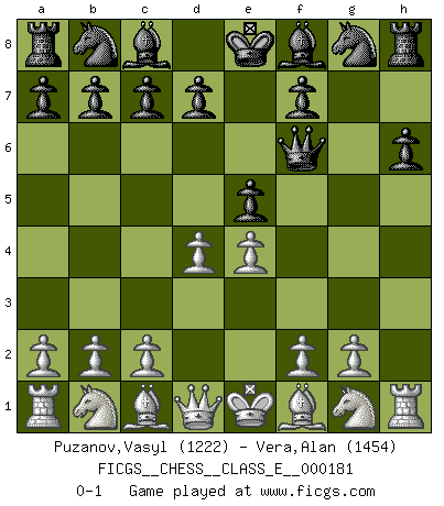 Last move : 0-1 2015 October 17 14:1:1 [Event "FICGS__CHESS__CLASS_E__000181"] [Site "FICGS"] [Date "2015.09.03"] [Round "1"] [White "Puzanov,Vasyl"] [Black "Vera,Alan"] [Result "0-1"] [WhiteElo "1222"] [BlackElo "1454"] 1.e4 g5 2.d4 h6 3.h4 gxh4 4.Rxh4 e5 5.Rh1 Qf6 0-1 This chess game has been lost on time (started : 2015.09.03 11:17:29) Reversed Grob (Borg/Basman defense/macho Grob) Player Black won this chess game. Follow this game move after move (download)Best by test: 1. e4 (Bobby Fischer) Was ist der Unterschied zwischen einem Strassenarbeiter und einem Schachspieler? --Der Schachspieler bewegt sich ab und zu. (Anonymous) Entre mas años cumplo, mas valoro los Peones. (Keres) Les Echecs sont affaire de jugement sensible. Savoir quand frapper et quand esquiver. (Fischer) If we don't succeed, we run the risk of failure. (George W. Bush)