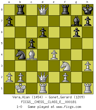 Last move : 1-0 2015 September 13 11:18:23 [Event "FICGS__CHESS__CLASS_E__000181"] [Site "FICGS"] [Date "2015.09.03"] [Round "1"] [White "Vera,Alan"] [Black "Gonet,Gerard"] [Result "1-0"] [WhiteElo "1454"] [BlackElo "1209"] 1.c4 Nf6 2.Nc3 g6 3.d4 Bg7 4.e4 d6 5.Be3 O-O 6.Nf3 Ng4 7.Qe2 e5 8.d5 f5 9.h3 Nxe3 10.Qxe3 f4 11.Qd2 Na6 12.O-O-O Bd7 13.Kb1 c6 14.Ne2 c5 15.g3 b5 16.gxf4 exf4 17.Nxf4 Rb8 18.Ne6 Bxe6 19.dxe6 bxc4 20.Bxc4 Nb4 21.e7 Kh8 22.exd8Q 1-0 English Opening Kingside Castling by player Black (move 5) Queenside Castling by player White (move 12) Promotion Queen by player White (move 22) Player White won this chess game. Follow this game move after move (download)Chess is the art of analysis. (Mikhail Botvinnik) Ein Buch ist ein Spiegel; wenn ein Affe hineinsieht, so kann kein Apostel heraus gucken. (Georg Christoph Lichtenberg) Después de la respuesta de las negras a 1.e4 con 1..e5, se quedan siempre tratando de entrar dentro del juego. (Howard Staunton) Pour se monter efficace, un Cavalier a besoin d'avant-postes ! Les Cavaliers font les meilleurs bloqueurs de pions passés. You can't play chess if you're groggy from pills. (Anatoly Karpov)