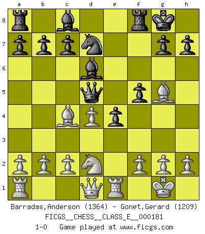 Last move : 1-0 2015 September 6 13:23:16 [Event "FICGS__CHESS__CLASS_E__000181"] [Site "FICGS"] [Date "2015.09.03"] [Round "1"] [White "Barradas,Anderson"] [Black "Gonet,Gerard"] [Result "1-0"] [WhiteElo "1364"] [BlackElo "1209"] 1.e4 e5 2.Nf3 d5 3.exd5 Bd6 4.Nc3 f5 5.d3 Nf6 6.Bg5 O-O 7.Be2 Qe8 8.O-O Nbd7 9.Re1 Qf7 10.d4 e4 11.Nd2 Nxd5 12.Nxd5 Qxd5 13.Bc4 1-0 QP counter-gambit : Maroczy gambit Kingside Castling by player Black (move 6) Kingside Castling by player White (move 8) Player White won this chess game. Follow this game move after move (download)After black's reply to 1.e4 with 1..e5, leaves him always trying to get into the game. (Howard Staunton) Das typische an einem Großmeister ist, daß er eine gewonnene Position schnell und schmerzlos gewinnt. (Irving Chernev) Yo nunca en mi vida he jugado la Defensa Francesa, que viene siendo la más aburrida de todas las Aperturas. (Wilhelm Steinitz) Les échecs, c'est l'imagination. (David Bronstein) Treat your password like your toothbrush. Don't let anybody else use it, and get a new one every six months. (Clifford Stoll)