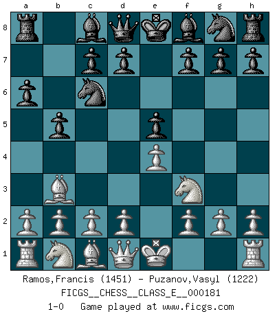 Last move : 1-0 2015 October 17 2:0:51 [Event "FICGS__CHESS__CLASS_E__000181"] [Site "FICGS"] [Date "2015.09.03"] [Round "1"] [White "Ramos,Francis"] [Black "Puzanov,Vasyl"] [Result "1-0"] [WhiteElo "1451"] [BlackElo "1222"] 1.e4 e5 2.Nf3 Nc6 3.Bb5 a6 4.Ba4 b5 5.Bb3 1-0 This chess game has been lost on time (started : 2015.09.03 11:17:29) Ruy Lopez : Caro variation Player White won this chess game. Follow this game move after move (download)We cannot resist the fascination of sacrifice, since a passion for sacrifices is part of a Chessplayer's nature. (Rudolf Spielman) Es ist wirklich schade, dass so viele Schachspieler nicht auf ihr Äußeres achten! (Alexandra Kosteniuk) Para mi, el Ajedrez es la vida y cada partida es como una nueva vida. Todo jugador de Ajedrez suele vivir muchas vidas durante su vida. (Eduard Gufeld) Je crois qu'il existe des manières très spécifiques de jouer efficacement contre une machine. Evidemment, nous n'avons aucune chance en technique pure, parce que l'ordinateur calcule de manière parfaite. Mais lorsque nous faisons appel à notre cerveau, en utilisant l'intuition et la compréhension, alors nous restons beaucoup plus forts. (Anatoli Karpov) Inventor: A person who makes an ingenious arrangement of wheels, levers and springs, and believes it civilization. (Ambrose Bierce, The Devil's Dictionary)