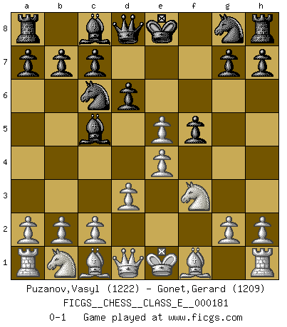 Last move : 0-1 2015 October 15 13:45:0 [Event "FICGS__CHESS__CLASS_E__000181"] [Site "FICGS"] [Date "2015.09.03"] [Round "1"] [White "Puzanov,Vasyl"] [Black "Gonet,Gerard"] [Result "0-1"] [WhiteElo "1222"] [BlackElo "1209"] 1.e4 e5 2.f4 Nc6 3.Nf3 f5 4.d3 Bc5 5.fxe5 d6 0-1 This chess game has been lost on time (started : 2015.09.03 11:17:29) King's gambit Player Black won this chess game. Follow this game move after move (download)In Chess, as it is played by masters, chance is practically eliminated. (Emanuel Lasker) Er war ein guter Schachspieler, aber ich kann Leute nicht ausstehen, die 'Heil Hitler' rufen (Über Alexander Aljechin). (Miguel Najdorf) Nada excita más a Grandes Maestros aburridos que una novedad teórica. (Dominic Lawson) Comme les marins qui ont mille raisons différentes d'aller en mer, les joueurs d'échecs en ont tout autant avant de s'installer devant une table et jouer... (Vincent Bertignac, philosophe) Difficult things take a long time, impossible things a little longer. (Author unknown)