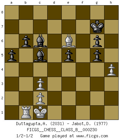 Last move : 1/2-1/2 2016 May 26 16:47:44 [Event "FICGS__CHESS__CLASS_B__000230"] [Site "FICGS"] [Date "2015.09.04"] [Round "1"] [White "Duttagupta,Aniruddha"] [Black "Jabot,Daniel"] [Result "1/2-1/2"] [WhiteElo "2031"] [BlackElo "1977"] 1.e4 c5 2.Nf3 d6 3.d4 cxd4 4.Nxd4 Nf6 5.Nc3 a6 6.h3 e6 7.g4 d5 8.Nde2 Nxe4 9.Nxe4 dxe4 10.Qxd8+ Kxd8 11.Be3 Nc6 12.O-O-O Ke8 13.Nc3 Bd7 14.Nxe4 Nb4 15.a3 Nd5 16.Bd2 Rc8 17.Bg2 Bc6 18.Rhe1 f6 19.g5 Kf7 20.Bf3 Ba4 21.Nc3 Nxc3 22.Bxc3 Rxc3 23.bxc3 Bxa3+ 24.Kb1 Rc8 25.Bh5+ g6 26.Rd4 Bc6 27.Be2 fxg5 28.f4 Bc5 29.Bg4 Re8 30.Rc4 Bb6 31.fxg5 e5 32.Rb4 Ba7 33.Rf1+ Kg7 34.Rf6 Re7 35.Re6 Rxe6 36.Bxe6 Bc5 37.Rb3 b6 38.Kc1 a5 39.Rb1 h6 40.h4 hxg5 1/2-1/2 Sicilian : Najdorf, Adams attack Queenside Castling by player White (move 12) This chess game ended in a draw. Follow this game move after move (download)Fischer Chess play was always razor-sharp, rational and brilliant. One of the best ever. (Dave Regis) Es ist im Leben wie im Schachspiel. Wir entwerfen einen Plan, dieser bleibt jedoch bedingt durch das, was im Schachspiel dem Gegner, im Leben dem Schicksal zu tun belieben wird. (Arthur Schopenhauer) El juego de Damas es para vagabundos. (Paul Morphy) J'apprécie les joueurs d'est-indienne, c'est grâce à eux que je nourris ma famille depuis tant d'années. (Petrosian) If you don't practice you don't deserve to win. (Andre Agassi)