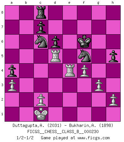 Last move : 1/2-1/2 2016 April 3 10:20:14 [Event "FICGS__CHESS__CLASS_B__000230"] [Site "FICGS"] [Date "2015.09.04"] [Round "1"] [White "Duttagupta,Aniruddha"] [Black "Bukharin,Alexey"] [Result "1/2-1/2"] [WhiteElo "2031"] [BlackElo "1898"] 1.e4 e5 2.Nf3 Nc6 3.d4 exd4 4.Nxd4 Bc5 5.Nb3 Bb6 6.Nc3 Nge7 7.Bg5 O-O 8.Qe2 d6 9.O-O-O Be6 10.f4 f6 11.Bh4 a5 12.Bf2 a4 13.Nc5 Bxc5 14.Bxc5 Qc8 15.Ba3 Bg4 16.Qc4+ Be6 17.Qb5 Ra5 18.Qd3 Bf7 19.Qd2 Qe6 20.Qf2 Rb8 21.Bb5 Rxb5 22.Nxb5 Qxa2 23.Qf3 Rc8 24.Rhe1 Qc4 25.Nc3 b5 26.e5 b4 27.exf6 Nf5 28.Re4 Qc5 29.Nd5 bxa3 30.Qxa3 Qxa3 31.bxa3 gxf6 32.Nxf6+ Kg7 33.Nd5 h5 34.g3 Bxd5 35.Rxd5 Kf6 1/2-1/2 Scotch : Potter variation Kingside Castling by player Black (move 7) Queenside Castling by player White (move 9) This chess game ended in a draw. Follow this game move after move (download)A win by an unsound combination, however showy, fills me with artistic horror. (Wilhelm Steinitz) Kasparov stellt für gewöhnlich die Regeln auf und bricht sie dann selbst wieder. (Alexej Shirov) Cuando tengo las piezas blancas, yo gano porque soy blanco; Cuando tengo las piezas negras, yo gano porque soy Bogolyubov. (Bogolyubov) Les pièces de l'échiquier étaient impitoyables. Elles le retenaient, elles l'absorbaient. Il y avait de l'horreur en cela, mais aussi une harmonie unique. Car, qu'y a-t-il dans le monde, à part les échecs ? (V. Nabokov) Nothing is more important for teaching us to understand the concepts we have than constructing fictitious ones. (Ludwig Wittgenstein)