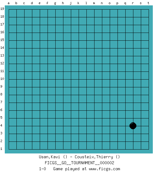 Last move : 1-0 2006 June 30 12:21:15 [Event "FICGS__GO__TOURNAMENT__000002"] [Site "FICGS"] [Date "2006.05.30"] [Round "1"] [Black "Usan,Kavi"] [White "Cousteix,Thierry"] [Result "1-0"] 1.r4 1-0 This go game has been lost on time (started : 2006.05.30 17:30:51) Here are the names of the openings (joseki) played in the four corners : Corner q4 : r4 1-0 Komoku (Somok, Xiao~mu`) 3-4 Point. The komoku (3-4) point is the traditional corner enclosure move.. Player Black won this Go (weiqi, baduk) game. Follow this game move after move (download)Strike at the waist of the knight's move. (Anonymous) There will be no order, only chaos. (Sol Robeson in Pi by Darren Aronofsky)