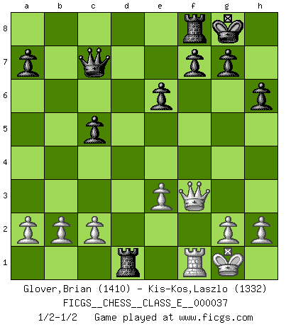 Last move : 1/2-1/2 2007 April 7 0:18:38 [Event "FICGS__CHESS__CLASS_E__000037"] [Site "FICGS"] [Date "2007.03.09"] [Round "1"] [White "Glover,Brian"] [Black "Kis-Kos,Laszlo"] [Result "1/2-1/2"] [WhiteElo "1410"] [BlackElo "1332"] 1.e4 c5 2.Nf3 d6 3.Bc4 Nf6 4.d3 Nc6 5.Be3 d5 6.exd5 Nxd5 7.O-O Nxe3 8.fxe3 e6 9.Nbd2 Bd6 10.Ne4 O-O 11.Qe2 Na5 12.Rad1 Qc7 13.d4 Nxc4 14.Qxc4 b6 15.dxc5 Bxc5 16.Nxc5 bxc5 17.Qh4 Bb7 18.Qh5 Rad8 19.Ng5 h6 20.Nf3 Bxf3 21.Qxf3 Rxd1 1/2-1/2 Sicilian Kingside Castling by player White (move 7) Kingside Castling by player Black (move 10) This chess game ended in a draw. Follow this game move after move (download)Chess is a fairy tale of 1001 blunders. (Savielly Tartakower) Schach verlangt totale Konzentration. (Robert James Fischer) Hoy en día, si tu no eres un Gran Maestro a los 14 años, es mejor que lo olvides. (Anand Viswanathan) Votre seul travail dans les ouvertures est d'obtenir un milieu de partie jouable. (Lajos Portish) Those parts of the system that you can hit with a hammer (not advised) are called hardware; those program instructions that you can only curse at are called software. (Anonymous)