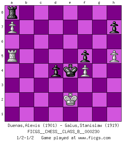 Last move : 1/2-1/2 2015 October 21 21:29:50 [Event "FICGS__CHESS__CLASS_B__000230"] [Site "FICGS"] [Date "2015.09.04"] [Round "1"] [White "Duenas,Alexis"] [Black "Galus,Stanislaw"] [Result "1/2-1/2"] [WhiteElo "1901"] [BlackElo "1919"] 1.d4 Nf6 2.c4 e6 3.g3 d5 4.Nf3 dxc4 5.Bg2 a6 6.Ne5 c5 7.Na3 cxd4 8.Naxc4 Be7 9.Bd2 a5 10.Qa4+ Nfd7 11.Bxa5 Ra6 12.Qb5 b6 13.Bb4 Bc5 14.Nd3 O-O 15.Bxc5 bxc5 16.O-O Ra7 17.b4 Ba6 18.Qa4 cxb4 19.Qxb4 Bxc4 20.Qxc4 Nb6 21.Qc5 Ra6 22.Nb2 Na4 23.Nxa4 Rxa4 24.Rfd1 Qc8 25.Qb5 Qa6 26.Qxa6 Nxa6 27.Bc6 Rb4 28.a3 Rb6 29.Bg2 Rd8 30.a4 Kf8 31.a5 Rb3 32.Rdb1 Rdb8 33.Be4 Ke7 34.Rxb3 Rxb3 35.Bd3 Nc5 36.a6 Rb8 37.a7 Ra8 38.Kg2 Nxd3 39.exd3 Kd6 40.Kf3 Kd5 41.h4 f6 42.h5 e5 43.g4 g6 44.Ra5+ Ke6 45.Ra6+ Kd5 46.Ke2 gxh5 47.gxh5 f5 48.f4 e4 49.dxe4+ Kxe4 50.Ra5 1/2-1/2 Catalan Opening Kingside Castling by player Black (move 14) Kingside Castling by player White (move 16) 10 pieces endgame at move 49 : White KRPPP , Black KRPPP WHITE : King + 1 Rook 3 Pawns BLACK : King + 1 Rook 3 Pawns This chess game ended in a draw. Follow this game move after move (download)First-class players lose to second class players because second-class players sometimes play a first-class game. (Tarrasch) Ich bewundere Kasparows phantasievolle Angriffssiege aus den Achtzigern und Neunzigern, aber wenn man sie mit dem Computer überprüft, nimmt der Computer in jeder zweiten Partie die Opfer an, verteidigt sich und gewinnt. (Vladimir Kramnik) El Ajedrez es un terrible juego. Si no controlas el centro, tu oponente tiene una posición mas holgada. Si tienes control del centro, ¡entonces realmente tu tienes algo de que preocuparte!. (Siegbert Tarrasch) Les Echecs sont affaire de jugement sensible. Savoir quand frapper et quand esquiver. (Fischer) All the troubles of the world come from being unable to sit alone in a quiet room. (Blaise Pascal)