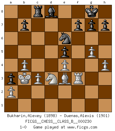 Last move : 1-0 2015 December 13 18:36:33 [Event "FICGS__CHESS__CLASS_B__000230"] [Site "FICGS"] [Date "2015.09.04"] [Round "1"] [White "Bukharin,Alexey"] [Black "Duenas,Alexis"] [Result "1-0"] [WhiteElo "1898"] [BlackElo "1901"] 1.e4 c5 2.Nf3 d6 3.d4 cxd4 4.Nxd4 Nf6 5.Nc3 a6 6.Be3 e5 7.Nb3 Be6 8.f3 Be7 9.Qd2 O-O 10.O-O-O a5 11.Kb1 a4 12.Nc1 a3 13.b3 Ra5 14.g4 d5 15.g5 Nxe4 16.Nxe4 dxe4 17.Qxd8 Rxd8 18.Rxd8+ Bxd8 19.fxe4 Nc6 20.c3 Ra8 21.Nd3 Rc8 22.h4 Ba5 23.b4 Bc7 24.Bh3 Bxh3 25.Rxh3 Nd8 26.Kc2 Ne6 27.Rf3 Bd8 28.Kb3 1-0 Sicilian : Najdorf, Byrne (English) attack Kingside Castling by player Black (move 9) Queenside Castling by player White (move 10) Player White won this chess game. Follow this game move after move (download)A Chess game is divided into three stages: the first, when you hope you have the advantage, the second when you believe you have an advantage, and the third... when you know you're going to lose ! (Savielly Tartakower) Schach ist eine Sache der genauen Beurteilung, wann man zuschlagen und wann man sich ducken muss. (Robert James Fischer) ¿Esta Bobby Fischer algo cuerdo?. (Salo Flohr) Toutes les manuvres exécutées sur une colonne ouverte ont pour but ultime l'intrusion définitive sur la septième ou la huitième rangée, en plein cur de la position ennemie. (Aaron Nimzovitch) It is the aim of the modern school, not to treat every position according to one general law, but according to the principle inherent in the position. (Richard Reti)