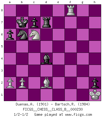 Last move : 1/2-1/2 2015 September 12 14:47:58 [Event "FICGS__CHESS__CLASS_B__000230"] [Site "FICGS"] [Date "2015.09.04"] [Round "1"] [White "Duenas,Alexis"] [Black "Bartsch,Reinhard Andrea"] [Result "1/2-1/2"] [WhiteElo "1901"] [BlackElo "1984"] 1.d4 Nf6 2.c4 e6 3.g3 d5 4.Nf3 dxc4 5.Bg2 Bd7 6.Ne5 Bc6 7.Nxc6 Nxc6 8.O-O Qd7 9.e3 a6 10.Qe2 Nd5 11.Qxc4 h5 12.Nd2 h4 13.Nb3 O-O-O 14.Bd2 f5 15.Rac1 Kb8 16.Rfe1 g5 17.Qe2 f4 18.exf4 gxf4 19.Qxe6 fxg3 20.fxg3 hxg3 21.Qxd7 gxh2+ 22.Kh1 Rxd7 23.Re8+ Ka7 24.Rf1 Bg7 25.Rxh8 Bxh8 26.Rf5 Nb6 27.Bxc6 bxc6 28.Na5 Bxd4 29.Nxc6+ Ka8 30.Rf8+ Kb7 1/2-1/2 Catalan Opening Kingside Castling by player White (move 8) Queenside Castling by player Black (move 13) This chess game ended in a draw. Follow this game move after move (download)Botvinnik tried to take the mystery out of Chess, always relating it to situations in ordinary life. He used to call Chess a typical inexact problem similar to those which people are always having to solve in everyday life. (Garry Kasparov) Deine Wertungszahl - vorausgesetzt einige Jahre schachliche Anstrengung - entspricht etwa dem zehnfachen Deines IQ plus 1000. (Jonathan Levitt) La enorme capacidad mental, en la que sin ella no puede un jugador de Ajedrez existir, es demasiado requerida por el Ajedrez al grado de que nunca podrá liberar su mente de este juego. (Albert Einstein) La vie et les Echecs sont tous les deux une lutte constante. (Lasker) God, you are such an idiot. - Actually, I thought I was more of a jerk. (Gregory House to Stacy Warner, House M.D.)