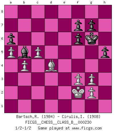Last move : 1/2-1/2 2015 October 5 15:25:44 [Event "FICGS__CHESS__CLASS_B__000230"] [Site "FICGS"] [Date "2015.09.04"] [Round "1"] [White "Bartsch,Reinhard Andrea"] [Black "Cirulis,Ilmars"] [Result "1/2-1/2"] [WhiteElo "1984"] [BlackElo "1908"] 1.e4 c6 2.d4 d5 3.Nc3 dxe4 4.Nxe4 Nf6 5.Nxf6+ exf6 6.c3 Bf5 7.Ne2 Bd6 8.Ng3 Bxg3 9.hxg3 O-O 10.Be2 Re8 11.O-O h6 12.Bc4 Na6 13.Bxa6 bxa6 14.b3 Qa5 15.Bd2 Qa3 16.c4 Qb2 17.Bb4 Rab8 18.Bc5 Re2 19.Ba3 Qc2 20.d5 cxd5 21.Qxd5 Be4 22.Qd6 Re8 23.Rfc1 Qd3 24.Qxd3 Bxd3 25.Bc5 Rd2 26.Bxa7 R8e2 27.a3 Rc2 28.Bd4 h5 29.a4 Rxc1+ 30.Rxc1 Rc2 31.Ra1 Kh7 32.f3 Kg6 33.Rd1 Bf5 34.a5 Be6 35.Bb6 Rc3 36.Rb1 Bf5 37.Rb2 Rc2 38.Bd4 Bd3 39.Rxc2 Bxc2 40.b4 Bd3 41.c5 Bb5 42.Kf2 1/2-1/2 Caro-Kann : Tartakower (Nimzovich) variation Kingside Castling by player Black (move 9) Kingside Castling by player White (move 11) This chess game ended in a draw. Follow this game move after move (download)You have to have the fighting spirit. You have to force moves and take chances. (Bobby Fischer) Die größte Kunst beim Schach besteht darin dem Gegner nicht zu zeigen was er tun kann. (Garry Kasparov) El Ajedrez es 99 por ciento táctica. (Teichmann) Même si l'adversaire joue le coup analysé précédemment, recommencez l'analyse en voyant la nouvelle position. Première règle de Blumenfeld It's not the will to win, but the will to prepare to win that makes the difference. (Bear Bryant)