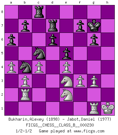 Last move : 1/2-1/2 2016 June 1 16:25:25 [Event "FICGS__CHESS__CLASS_B__000230"] [Site "FICGS"] [Date "2015.09.04"] [Round "1"] [White "Bukharin,Alexey"] [Black "Jabot,Daniel"] [Result "1/2-1/2"] [WhiteElo "1898"] [BlackElo "1977"] 1.e4 c5 2.Nf3 d6 3.Bb5+ Bd7 4.Bxd7+ Qxd7 5.c4 Nc6 6.Nc3 Nf6 7.d4 cxd4 8.Nxd4 g6 9.f3 Bg7 10.Nde2 a6 11.O-O O-O 12.a4 e6 13.Bg5 Qc7 14.Kh1 Nd7 15.Rb1 Nc5 16.b3 Rfc8 17.Be3 Rd8 18.Qc2 Nb4 19.Qd2 Rac8 20.Rfd1 Qe7 21.Bg5 Bf6 22.Bxf6 Qxf6 23.Qe3 Rd7 24.Rb2 Qd8 25.Nf4 h5 26.Nce2 Qg5 27.g3 h4 28.Rg1 e5 29.Nd5 Qxe3 30.Nxe3 hxg3 31.hxg3 Kg7 1/2-1/2 Sicilian : Canal-Sokolsky attack, Sokolsky variation Kingside Castling by player White (move 11) Kingside Castling by player Black (move 11) This chess game ended in a draw. Follow this game move after move (download)Chess is everything: art, science and sport. (Anatoly Karpov) Korrekt heißt in Deutschland die Haltung eines Mannes, dessen Benehmen nach dem Urteile seiner Nachbarn seiner Stellung angemessen ist. Um korrekt zu sein, muß man sich der Meinung der anderen anpassen... (Emanuel Lasker) Un Peón pasado es un criminal, quién debe ser mantenido bajo candado y llave. Leves medidas, tales como vigilancia policiaca, no son suficientes. (Aaron Nimzovich) Les échecs, c'est l'imagination. (David Bronstein) The bottom line is always the bottom line. (Johann Piek)