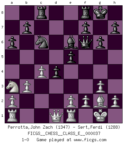 Last move : 1-0 2007 June 16 7:51:24 [Event "FICGS__CHESS__CLASS_E__000037"] [Site "FICGS"] [Date "2007.03.09"] [Round "1"] [White "Perrotta,John Zach"] [Black "Sert,Ferdi"] [Result "1-0"] [WhiteElo "1347"] [BlackElo "1288"] 1.c4 c5 2.Nf3 Nf6 3.g3 g6 4.Bg2 Bg7 5.Nc3 O-O 6.O-O d5 7.d4 cxd4 8.Nxd4 e5 9.Ndb5 a6 10.Na3 d4 11.Nd5 Nc6 12.Bg5 Be6 13.Nxf6+ Bxf6 14.Bxf6 Qxf6 15.Re1 Rac8 16.b3 1-0 This chess game has been lost on time (started : 2007.03.09 21:47:23) English : Symmetrical variation Kingside Castling by player Black (move 5) Kingside Castling by player White (move 6) Player White won this chess game. Follow this game move after move (download)Every Pawn is a potential Queen. (James Mason) Der Traum, für den ich lebe, ist der von einem freien Russland. Viele mögen sagen: Russland hat doch ein Parlament, einen gewählten Präsidenten. Aber ich spüre, dass in meiner Heimat die Angst wiederkehrt. Eine Angst, sich frei zu äußern, bestimmte Dinge zu tun (Garry Kasparov) Es el objetivo de la escuela moderna no tratar cada posición de acuerdo a una regla general, sino de acuerdo al principio inherente en la posición. (Richard Reti) Un journaliste : 'Vous préférez avoir une dame de plus sur l'échiquier ou au lit ?' Boris Spassky : 'Ca dépend de la position.' Question: Is 'This statement is paradoxical' a paradoxical statement ? Or is it a meta-paradox ? (Normajean Yates)
