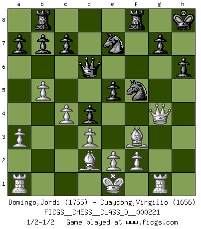 Last move : 1/2-1/2 2015 December 28 22:32:44 [Event "FICGS__CHESS__CLASS_D__000221"] [Site "FICGS"] [Date "2015.09.05"] [Round "1"] [White "Domingo,Jordi"] [Black "Cuaycong,Virgilio"] [Result "1/2-1/2"] [WhiteElo "1755"] [BlackElo "1656"] 1.g4 e5 2.c4 Bc5 3.Nc3 Nc6 4.d3 d6 5.h3 f5 6.Bg2 Nge7 7.a3 O-O 8.Nf3 fxg4 9.hxg4 Bxg4 10.b4 Bxf3 11.Bxf3 Bd4 12.Bb2 Qd7 13.Qd2 Bxc3 14.Bxc3 d5 15.Qg5 Qd6 16.Qh4 h6 17.Rg1 Kh8 18.Qg3 Nf5 19.Qg4 d4 20.Bd2 Rab8 21.b5 Nce7 1/2-1/2 Grob's attack Kingside Castling by player Black (move 7) This chess game ended in a draw. Follow this game move after move (download)Human affairs are like a Chess game: only those who do not take it seriously can be called good players. (Hung Tzu Ch'eng) Intelligenz läßt sich nicht am Weg, sondern nur am Ergebnis feststellen. (Garry Kasparov) Si tu oponente no puede hacer nada activo, entonces no apures la posición; En vez de eso, dejalo estar sentado ahí, sufriendo y rogandote por un empate. (Jeremy Silman) Tout change constamment, y compris dans le monde des Echecs. (Botvinnik) Thus, what is of supreme importance in war is to attack the enemy's strategy. (Sun Tzu)