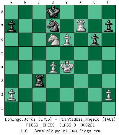 Last move : 1-0 2015 November 16 23:11:15 [Event "FICGS__CHESS__CLASS_D__000221"] [Site "FICGS"] [Date "2015.09.05"] [Round "1"] [White "Domingo,Jordi"] [Black "Piantadosi,Angelo"] [Result "1-0"] [WhiteElo "1755"] [BlackElo "1461"] 1.g4 d5 2.Bg2 Bxg4 3.c4 e6 4.cxd5 exd5 5.Qb3 Nf6 6.Nc3 Nbd7 7.Nxd5 Be6 8.Nxf6+ Nxf6 9.Qxb7 Bd5 10.Bxd5 Qxd5 11.Qxd5 Nxd5 12.Nf3 Be7 13.d3 O-O 14.Bd2 Bf6 15.e4 Nb6 16.O-O-O c5 17.Bc3 Bxc3 18.bxc3 Rfd8 19.Kc2 f6 20.Rhg1 Kf7 21.Nd2 Rab8 22.Rb1 Nd7 23.f4 g6 24.Rb3 c4 25.Nxc4 Nc5 26.Rxb8 Rxb8 27.e5 fxe5 28.fxe5 Rd8 29.Rf1+ Ke6 30.d4 Nd7 31.Kd3 Ke7 32.Ke4 Rc8 33.Nd6 Rxc3 34.Rf7+ Kd8 35.e6 1-0 Grob : Fritz gambit Kingside Castling by player Black (move 13) Queenside Castling by player White (move 16) Player White won this chess game. Follow this game move after move (download)A bad plan is better than none at all. (Frank Marshall) Sie führen leise Selbstgespräche, schlürfen lautstark ihre Getränke, schmatzen hörbar beim Essen, blasen ihrem Gegenüber Rauch in die Augen, niesen ihm ins Gesicht, starren ihn unverwandt an, bis er sich unter ihren Blicken windet, rutschen ständig auf ihrem Stuhl hin und her, rülpsen und bohren in der Nase. (Anonymous) El Ajedrez por encima de todo... ¡es una pelea!. (Emanuel Lasker) Un journaliste : 'Vous préférez avoir une dame de plus sur l'échiquier ou au lit ?' Boris Spassky : 'Ca dépend de la position.' 'preceded by its own quotation yields a falsehood' preceded by its own quotation yields a falsehood. (W. V. O. Quine - Set Theory And Its Logic, 1953)