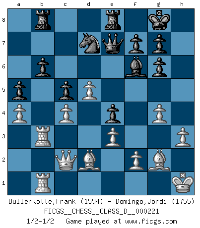 Last move : 1/2-1/2 2015 November 24 19:44:5 [Event "FICGS__CHESS__CLASS_D__000221"] [Site "FICGS"] [Date "2015.09.05"] [Round "1"] [White "Bullerkotte,Frank"] [Black "Domingo,Jordi"] [Result "1/2-1/2"] [WhiteElo "1594"] [BlackElo "1755"] 1.d4 d5 2.c4 dxc4 3.Nf3 a6 4.e3 Bg4 5.Bxc4 e6 6.h3 Bh5 7.Nc3 Nf6 8.g4 Bg6 9.Ne5 Nbd7 10.Nxg6 hxg6 11.Bf1 c6 12.Bg2 Qc7 13.Bd2 Nd5 14.Rc1 Nxc3 15.bxc3 Be7 16.c4 e5 17.O-O O-O 18.Qb3 Rfe8 19.Rb1 Rab8 20.a4 Bf6 21.d5 e4 22.Bb4 c5 23.Bd2 Qe5 24.Qc2 b6 25.Rb3 Qe7 26.Rfb1 a5 27.Kh1 Rbd8 28.Rd1 Rb8 29.Rdb1 1/2-1/2 QGA : Alekhine defense Kingside Castling by player White (move 17) Kingside Castling by player Black (move 17) This chess game ended in a draw. Follow this game move after move (download)There are tough players and nice guys, and I'm a tough player. (Bobby Fischer) Wer der Ansicht ist, daß alle Schachspieler verrückt sind, wird durch Studium des Lebens von Emil Josef Diemer nicht auf andere Gedanken kommen. (Hans Ree) El Ajedrez es un invernadero donde los frutos del carácter pueden madurar mas completamente que en la vida. (Edward Morgan Foster) J'ai toujours senti une vague pitié pour l'homme qui ne connaît rien aux échecs, tout comme j'en aurais pour un homme ignorant de l'amour. Les Echecs, comme la musique ou comme l'amour, ont le pouvoir de rendre heureux. (Siegbert Tarrasch) Shallow men believe in luck. Strong men belive in cause and effect. (Ralph Waldo Emerson)