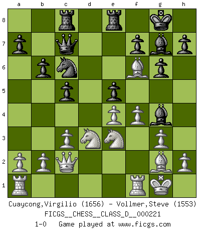 Last move : 1-0 2015 October 16 0:35:17 [Event "FICGS__CHESS__CLASS_D__000221"] [Site "FICGS"] [Date "2015.09.05"] [Round "1"] [White "Cuaycong,Virgilio"] [Black "Vollmer,Steve"] [Result "1-0"] [WhiteElo "1656"] [BlackElo "1553"] 1.Nf3 d5 2.g3 c5 3.d3 Nf6 4.Bg2 g6 5.O-O Bg7 6.Nbd2 O-O 7.e4 Nc6 8.c3 dxe4 9.dxe4 Qc7 10.Qe2 Bd7 11.Ne1 Rac8 12.Nd3 b6 13.Nc4 e5 14.Bg5 Rfe8 15.f4 Bg4 16.Qc2 Nd7 17.Ne3 Nf6 18.Bxf6 1-0 Reti : King's Indian attack (with ...c5) Kingside Castling by player White (move 5) Kingside Castling by player Black (move 6) Player White won this chess game. Follow this game move after move (download)If Chess is a science, it's a most inexact one. If Chess is an art, it is too exacting to be seen as one. If Chess is a sport, it's too esoteric. If Chess is a game, it's too demanding to be just a game. If Chess is a mistress, she's a demanding one. If Chess is a passion, it's a rewarding one. If Chess is life, it's a sad one. (Unknown) Ich tröste mich mit dem Vergnügen, daß Schachfans, Zuschauer und Leser glücklich sind, wenn ein Großmeister etwas riskiert, statt nur Klötzchen zu schieben. (Mikhail Nekhemyevich Tal) El Ajedrez, como cualquier otra actividad creativa, puede existir solo a través de méritos combinados de aquellos que tienen talento creativo y de aquellos que tienen la habilidad de organizar un trabajo creativo. (Mikhail Botvinnik) Pour moi, les échecs ne sont pas un jeu mais un art. (Alexandre Alekhine) The difference between perseverance and obstinacy is that one comes from a strong will, and the other from a strong won't. (Henry Ward Beecher)