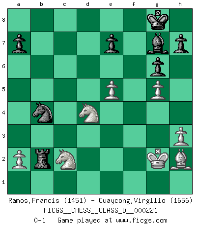 Last move : 0-1 2015 November 6 13:55:48 [Event "FICGS__CHESS__CLASS_D__000221"] [Site "FICGS"] [Date "2015.09.05"] [Round "1"] [White "Ramos,Francis"] [Black "Cuaycong,Virgilio"] [Result "0-1"] [WhiteElo "1451"] [BlackElo "1656"] 1.e4 d6 2.d4 Nf6 3.Nc3 g6 4.Be3 c6 5.f4 Bg7 6.Nf3 O-O 7.Qd2 b5 8.e5 Ng4 9.Bg1 dxe5 10.dxe5 Qxd2+ 11.Nxd2 f6 12.h3 Nh6 13.Nf3 fxe5 14.fxe5 Nf5 15.Bh2 Ne3 16.Kd2 Bh6 17.Ke2 Nxc2 18.Rd1 b4 19.Ne4 Ne3 20.Rd3 Ba6 21.Nc5 Bxd3+ 22.Nxd3 c5 23.g4 c4 24.Nc5 Rc8 25.Ne6 c3 26.bxc3 bxc3 27.g5 c2 28.Bg2 Nxg2 29.Rc1 Bg7 30.Kf2 Na6 31.Kxg2 Rab8 32.Nfd4 Rb1 33.Rxc2 Rxc2+ 34.Nxc2 Rb2 35.Ned4 Nb4 0-1 Pirc defense Kingside Castling by player Black (move 6) Player Black won this chess game. Follow this game move after move (download)The King is a fighting piece. Use it ! (Wilhelm Steinitz) Charakterschwächen offenbaren sich normalerweise während einer Schachpartie. (Garry Kasparov) El Ajedrez es un cuento de Hadas de las 1001 metidas de pata. (Savielly Tartakower) Le génie consiste à savoir transgresser les règles au moment opportun. (Teichmann) It's not enough to succeed. Others must fail. (Gore Vidal)