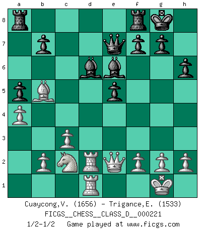 Last move : 1/2-1/2 2015 October 31 13:43:45 [Event "FICGS__CHESS__CLASS_D__000221"] [Site "FICGS"] [Date "2015.09.05"] [Round "1"] [White "Cuaycong,Virgilio"] [Black "Trigance,Emile"] [Result "1/2-1/2"] [WhiteElo "1656"] [BlackElo "1533"] 1.e4 c6 2.d4 d5 3.Nc3 dxe4 4.Nxe4 Nd7 5.Nf3 Ngf6 6.Ng3 e6 7.Bd3 c5 8.O-O cxd4 9.Nxd4 Bc5 10.Nb3 Bb6 11.Qe2 O-O 12.Bd2 a5 13.a4 Qe7 14.Rfd1 Bc7 15.Bb5 Nd5 16.Ne4 N7f6 17.Nxf6+ Nxf6 18.Bg5 h6 19.Bxf6 Qxf6 20.c3 Qe7 21.Nd4 Bd6 22.Rd2 e5 23.Nc2 Be6 24.Rad1 1/2-1/2 Caro-Kann : Steinitz variation Kingside Castling by player White (move 8) Kingside Castling by player Black (move 11) This chess game ended in a draw. Follow this game move after move (download)Nowadays, when you're not a grandmaster at 14, you can forget about it. (Anand Viswanathan) Wenn Spassky eine Figur opfert kannst du genauso gut aufgeben. Aber wenn Tal eine Figur opfert, spiel weiter. Er könnte noch eine weitere opfern, und dann ... wer weiß? (Miguel Najdorf) Yo tuve un dolor de muelas en la primer partida. En el segundo juego, tuve un dolor de cabeza. En el tercero, tuve un ataque de reumatísmo. En la cuarta partida, no me sentía muy bien. ¿Y en el quinto juego? Bueno, ¿que acaso uno tiene que ganar todos los juegos?. (Siegbert Tarrasch) Même un GMI sait rarement calculer sur plus de cinq coups une attaque à sacrifices. (Rudolf Spielmann) There is a great deal of difference between an eager man who wants to read a book and a tired man who wants a book to read. (G.K. Chesterton)