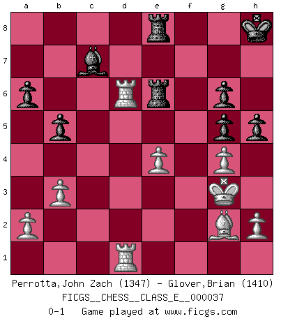 Last move : 0-1 2007 July 22 18:33:36 [Event "FICGS__CHESS__CLASS_E__000037"] [Site "FICGS"] [Date "2007.03.09"] [Round "1"] [White "Perrotta,John Zach"] [Black "Glover,Brian"] [Result "0-1"] [WhiteElo "1347"] [BlackElo "1410"] 1.d4 d5 2.g3 Nf6 3.c4 Bf5 4.Nf3 e6 5.Bg2 Nbd7 6.O-O dxc4 7.Na3 Nb6 8.Ne5 c6 9.Naxc4 Nxc4 10.Nxc4 Be7 11.Bf4 O-O 12.Re1 Nd5 13.Bc1 Bg6 14.e4 Nf6 15.Bf4 b5 16.Ne5 Rc8 17.Rc1 Nd7 18.Nxg6 fxg6 19.Qb3 Kh8 20.Qxe6 Rf6 21.Qb3 Nb6 22.Be5 Rf8 23.f4 Bf6 24.Red1 Nc4 25.Bf1 Nb6 26.Rc5 Nd7 27.Rc2 Nxe5 28.fxe5 Bxe5 29.Rcd2 Bc7 30.d5 Bb6+ 31.Kg2 Qd6 32.dxc6 Qxc6 33.Qd5 a6 34.Qxc6 Rxc6 35.Kh3 Re6 36.Bg2 h5 37.Rd6 Rfe8 38.b3 g5 39.g4 g6 40.Kg3 Bc7 0-1 Queen's pawn game Kingside Castling by player White (move 6) Kingside Castling by player Black (move 11) Player Black won this chess game. Follow this game move after move (download)On the chessboard, lies and hypocrisy do not survive long. (Emanuel Lasker) Es gibt nur zwei wahre Schachgenies - das andere war Wilhelm Steinitz, der Weltmeister von 1872 bis 1894. (Robert James Fischer) Fischer era un maestro de claridad y un Rey del posicionamiento astuto. Sus oponentes podían ver hacia donde se dirigía pero eran impotentes para detenerlo. (Bruce Pandolfini) Pour moi, les échecs ne sont pas un jeu mais un art. (Alexandre Alekhine) Art disturbs, science reassures. (Georges Braque, Le Jour et la Nuit)