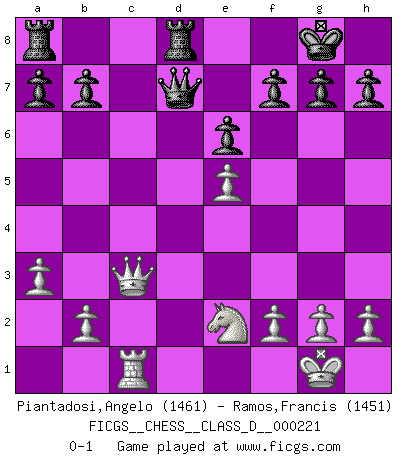 Last move : 0-1 2015 October 7 22:29:55 [Event "FICGS__CHESS__CLASS_D__000221"] [Site "FICGS"] [Date "2015.09.05"] [Round "1"] [White "Piantadosi,Angelo"] [Black "Ramos,Francis"] [Result "0-1"] [WhiteElo "1461"] [BlackElo "1451"] 1.e4 c5 2.c3 d5 3.exd5 Qxd5 4.d4 cxd4 5.cxd4 Nc6 6.Nf3 Bg4 7.Be2 Nf6 8.Nc3 Qd8 9.O-O e6 10.Bg5 Be7 11.Rc1 O-O 12.Ne5 Bxe2 13.Nxe2 Nxe5 14.dxe5 Nd5 15.Bxe7 Qxe7 16.Qd2 Rfd8 17.Qe1 Nb4 18.a3 Nd3 19.Qc3 Nxc1 20.Rxc1 Qd7 0-1 Sicilian : Alapin's variation (2.c3) Kingside Castling by player White (move 9) Kingside Castling by player Black (move 11) Player Black won this chess game. Follow this game move after move (download)Chess is like war on a board. (Bobby Fischer) Ich kämpfe solange mein Gegner einen Fehler machen kann. (Emanuel Lasker) Solo los afeminados hacen el Enroque. (Rob Sillars) C'est une question de caractère, Beaucoup de gens perdent leur motivation très vite. D'autres, ils sont rares, peuvent la conserver très longtemps. J'aime les échecs, encore aujourd'hui je suis heureux d'analyser des parties. J'aime toujours gagner, je déteste encore perdre. Bien jouer est important pour mon intégrité intellectuelle et morale. Et puis les échecs vivent en ce moment une période historique grâce à Internet. Ils se développent dans les systèmes éducatifs à travers le monde. Ils sortent de leur ghetto, et c'est mon rôle de mener à bien cette révolution. (Gary Kasparov) Those who make the worst use of their time are the first to complain of its brevity. (Jean de la Bruyere)