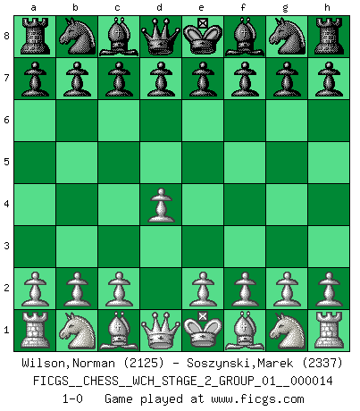 Last move : 1-0 2015 October 6 12:12:1 [Event "FICGS__CHESS__WCH_STAGE_2_GROUP_01__000014"] [Site "FICGS"] [Date "2015.09.05"] [Round "1"] [White "Wilson,Norman"] [Black "Soszynski,Marek"] [Result "1-0"] [WhiteElo "2125"] [BlackElo "2337"] 1.d4 1-0 This chess game has been lost on time (started : 2015.09.05 22:55:47) Queen's pawn Player White won this chess game. Follow this game move after move (download)Castle early and often. (Rob Sillars) Ivan Sokolov treibt mich als Beifahrer an mit go Loeky go - . (Loek van Wely) Bobby Fischer es el mas grande genio de Ajedrez de todos los tiempos. (Alexander Kotov) Les Echecs sont et restent toujours un combat, un combat intégral comme la boxe, la lutte ou un autre sport, et où il doit y avoir un vainqueur et un vaincu. (Joseph Emil Diemer) Pushing plastic is for the many, pushing virtual pieces is for the fewer, pushing wood is for the very few. (Normajean Yates)