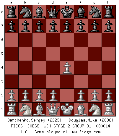 Last move : 1-0 2015 October 6 0:11:27 [Event "FICGS__CHESS__WCH_STAGE_2_GROUP_01__000014"] [Site "FICGS"] [Date "2015.09.05"] [Round "1"] [White "Demchenko,Sergey"] [Black "Douglas,Mike"] [Result "1-0"] [WhiteElo "2223"] [BlackElo "2036"] 1.e4 1-0 This chess game has been lost on time (started : 2015.09.05 22:55:47) King's pawn Opening Player White won this chess game. Follow this game move after move (download)Bobby Fischer is the greatest Chess player who has ever lived. (Ken Smith) Das Schachspiel hat wie die Liebe, die Musik, die Fähigkeit, den Menschen glücklich zu machen. Ich habe ein leises Gefühl des Bedauerns für jeden, der das Schachspiel nicht kennt, so wie ich jeden bedaure, der die Liebe nicht kennt. (Siegbert Tarrasch) Ser exitoso en el Ajedrez te permite descubrir tu propia personalidad. Eso es lo que deseo para los niños de mi clase. (Saudin Robovic) On n'a jamais que l'âge auquel on a commence à jouer aux échecs car après on cesse de vieillir. (Capablanca) Nowadays, anyone who cannot speak English and is incapable of using the Internet is regarded as backward. (Al-Waleed bin Talal)