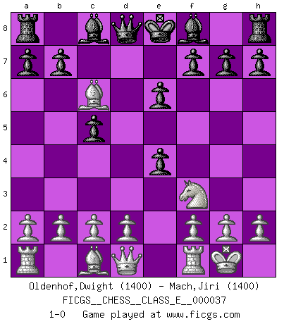 Last move : 1-0 2007 May 5 7:50:32 [Event "FICGS__CHESS__CLASS_E__000037"] [Site "FICGS"] [Date "2007.03.09"] [Round "1"] [White "Oldenhof,Dwight"] [Black "Mach,Jiri"] [Result "1-0"] [WhiteElo "1400"] [BlackElo "1400"] 1.e4 c5 2.Bc4 e6 3.Nc3 Nc6 4.Nf3 Nf6 5.O-O Nxe4 6.Nxe4 d5 7.Bb5 dxe4 8.Bxc6+ 1-0 This chess game has been lost on time (started : 2007.03.09 21:47:23) Sicilian defense Kingside Castling by player White (move 5) Player White won this chess game. Follow this game move after move (download)There's never before been a Chess player with such a thorough knowledge of the intricacies of the game and such an absolutely indomitable will to win. I think Bobby is the greatest player that ever lived. (Lisa Lane) Obendrein hat der FIDE-Präsident den Revolutionsführer Gaddafi zum »Großmeister« ernannt, am Ende der WM. Das ist lächerlich! (Joel Lautier) Un juego de Ajedrez es un dialogo, una conversación entre un jugador y su oponente. Cada movimiento del oponente puede contener amenazas o tropiezos, pero un jugador no se puede defender de las amenazas o tomar ventaja de los tropiezos si es que no se pregunta a sí mismo: ¿Que es lo que mi oponente va a hacer después de cada movida?. (Bruce A. Moon) Il (Jacob Murray) ne joue pas pour le bon coup, mais pour le meilleur. (Eloi Relange) Man is reluctant to give credit for intelligence to anyone, except his enemies. (Albert Einstein)