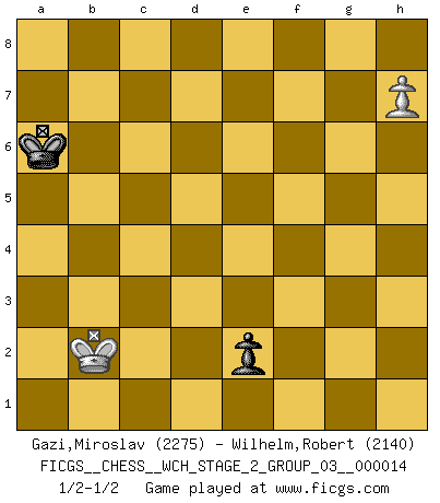 Last move : 1/2-1/2 2016 March 4 17:53:3 [Event "FICGS__CHESS__WCH_STAGE_2_GROUP_03__000014"] [Site "FICGS"] [Date "2015.09.05"] [Round "1"] [White "Gazi,Miroslav"] [Black "Wilhelm,Robert"] [Result "1/2-1/2"] [WhiteElo "2275"] [BlackElo "2140"] 1.d4 d5 2.c4 c6 3.Nf3 Nf6 4.Nc3 e6 5.Bg5 dxc4 6.e4 b5 7.e5 h6 8.Bh4 g5 9.Nxg5 hxg5 10.Bxg5 Nbd7 11.exf6 Bb7 12.g3 c5 13.d5 Qb6 14.Bg2 O-O-O 15.O-O b4 16.Na4 Qb5 17.a3 Nb8 18.axb4 cxb4 19.Qg4 Bxd5 20.Rfc1 Nc6 21.Bxd5 Rxd5 22.Rxc4 Rxg5 23.Qd4 Kb8 24.Rxc6 Rxg3+ 25.fxg3 Qxc6 26.Rd1 Qc7 27.b3 Kc8 28.Qd3 Rh5 29.Qf3 Rb5 30.Qa8+ Rb8 31.Qe4 Rb5 32.Rd4 Kb8 33.Qe2 a6 34.Qd3 Qc1+ 35.Kg2 Qc6+ 36.Qe4 Qxe4+ 37.Rxe4 Rf5 38.g4 Rxf6 39.h4 Kc7 40.Rc4+ Kd7 41.h5 e5 42.g5 Rc6 43.Rxc6 Kxc6 44.Kg3 Kd5 45.Nb6+ Ke6 46.h6 f6 47.Kg4 fxg5 48.h7 Bg7 49.Kxg5 Bh8 50.Nc4 e4 51.Kf4 Kd5 52.Ke3 Bd4+ 53.Ke2 Bf6 54.Ne3+ Kd4 55.Ng4 Bg7 56.Kd2 a5 57.Ne3 Bf6 58.Nd1 a4 59.bxa4 b3 60.a5 Kc5 61.Nf2 Kb5 62.a6 b2 63.Kc2 e3 64.Nd3 Kxa6 65.Nxb2 Bxb2 66.Kxb2 e2 1/2-1/2 QGD Slav : 4.Nc3 Queenside Castling by player Black (move 14) Kingside Castling by player White (move 15) 10 pieces endgame at move 47 : White KNPP , Black KBPPPP WHITE : King + 1 Knight 2 Pawns BLACK : King + 1 Bishop 4 Pawns 9 pieces endgame at move 49 : White KNPP , Black KBPPP WHITE : King + 1 Knight 2 Pawns BLACK : King + 1 Bishop 3 Pawns 8 pieces endgame at move 59 : White KNPP , Black KBPP WHITE : King + 1 Knight 2 Pawns BLACK : King + 1 Bishop 2 Pawns 7 pieces endgame at move 64 : White KNP , Black KBPP WHITE : King + 1 Knight 1 Pawn BLACK : King + 1 Bishop 2 Pawns 6 pieces endgame at move 65 : White KNP , Black KBP WHITE : King + 1 Knight 1 Pawn BLACK : King + 1 Bishop 1 Pawn 5 pieces endgame at move 65 : White KP , Black KBP WHITE : King + 1 Pawn BLACK : King + 1 Bishop 1 Pawn 4 pieces endgame at move 66 : White KP , Black KP WHITE : King + 1 Pawn BLACK : King + 1 Pawn This chess game ended in a draw. Follow this game move after move (download)In a gambit you give up a Pawn for the sake of getting a lost game. (Samuel Standige Boden) Wenn Dein Gegner dir ein Remis anbietet, versuch herauszufinden, weshalb er glaubt schlechter zu stehen. (Nigel Short) Un mal día en el Ajedrez, es mejor que cualquier buen día en el trabajo. (Anonymous) Ce qui est bien, c'est d'avoir tout un tas de pièces en prise : l'adversaire ne peut en prendre qu'une à la fois. Cité par Thierry Audin. A computer lets you make more mistakes faster than any invention in human history - with the possible exceptions of handguns and tequila. (Mitch Ratcliffe)