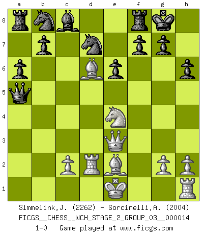 Last move : 1-0 2015 October 27 15:14:15 [Event "FICGS__CHESS__WCH_STAGE_2_GROUP_03__000014"] [Site "FICGS"] [Date "2015.09.05"] [Round "1"] [White "Simmelink,Joop"] [Black "Sorcinelli,Andrea"] [Result "1-0"] [WhiteElo "2262"] [BlackElo "2004"] 1.e4 c5 2.d4 cxd4 3.Nf3 d6 4.Nxd4 Nf6 5.Nc3 a6 6.Bg5 e6 7.f4 Qb6 8.Qd2 Qxb2 9.Rb1 Qa3 10.e5 dxe5 11.fxe5 Nfd7 12.Ne4 h6 13.Bh4 Qxa2 14.Rd1 Qd5 15.Qe3 Qxe5 16.Be2 Bc5 17.Bg3 Bxd4 18.Rxd4 Qa5+ 19.Rd2 O-O 20.Bd6 1-0 This chess game has been lost on time (started : 2015.09.05 22:55:45) Sicilian : Smith-Morra gambit Kingside Castling by player Black (move 19) Player White won this chess game. Follow this game move after move (download)During a Chess competition a Chessmaster should be a combination of a beast of prey and a monk. (Alexander Alekhine) Ich bin Weltmeister und muß mit niemandem irgend etwas diskutieren. (Viswanathan Anand) Los tropiezos estan todos ahí en el tablero, esperando que se cometan. (Savielly Tartakover) Les sacrifices démontrent seulement que quelqu'un a gaffé. (Savielly Tartacover) The human is the only animal species whose members are able to talk themselves into difficulties that would not otherwise exist. (Wendell Johnson)